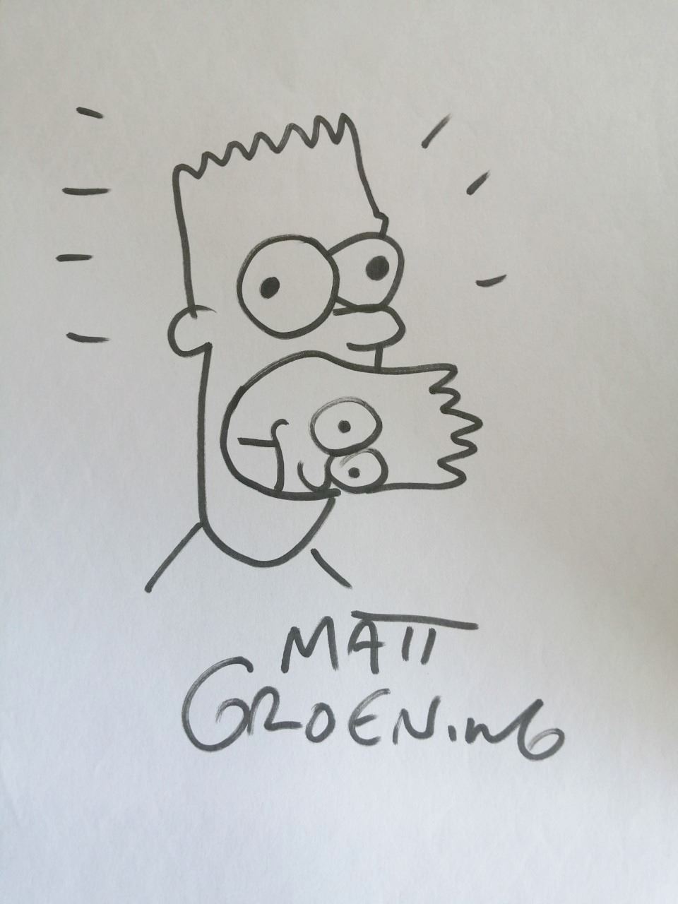 A drawing of Bart with Bart's head in his mouth by creator Matt Groening, in black marker, signed and supplied with coa. A4 paper.