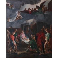 BARTHOLOMEO SPRANGER Prag school, around 1630, follower of Herdarnas tillbedjan Oil on canvas, 114 x 91,5 cm; relined, older retouches and repairs Painting after an engraving by Jan Muller, after a composition of Bartholomeus Spranger. EXPERTISE: Cabinet Turquin, Mauduit, Etienne, Paris