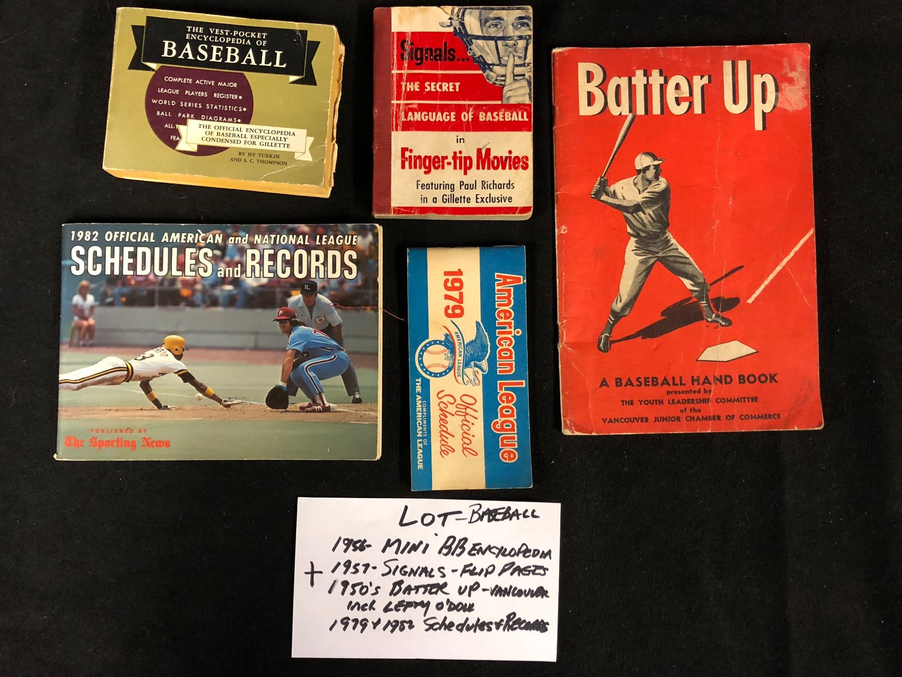 1956 MINI ENCYCLOPEDIA, 1959 SIGNALS-FLIP PASSES, 1950'S BATTER UP, 1970-80'S SCHEDULES & RECORDS