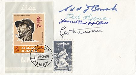 First day postal cover honoring Joe Dimaggio with a Babe Ruth stamp also affixed thereto, Feb. 28, 1969, signed by Hall of Famers EDDIE ROUSH, TED LYONS, JAMES "COOL PAPA" BELL and LEO DUROCHER. Fine.
