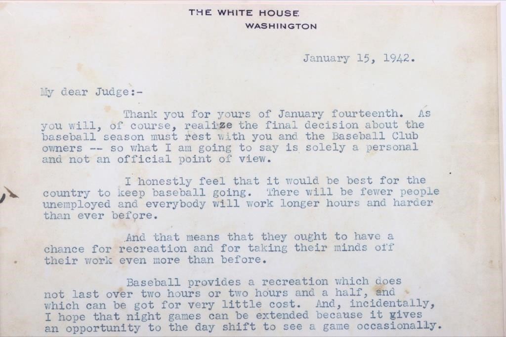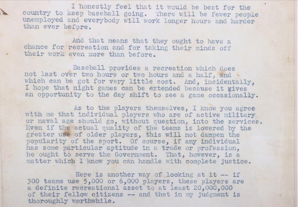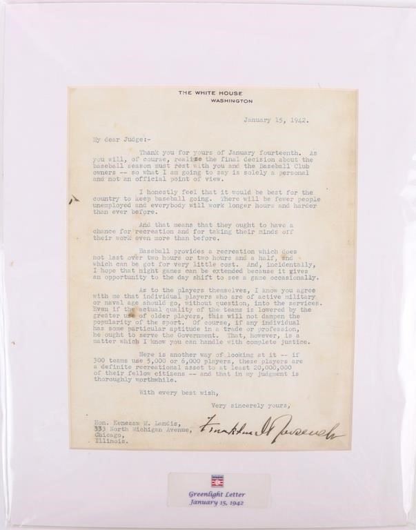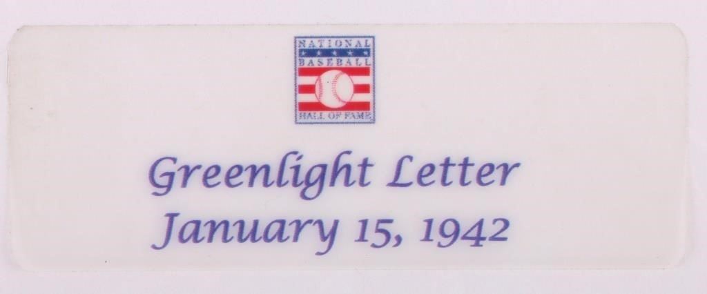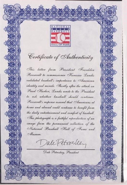 one (1) Certified Photograph of the Greenlight Letter. The greenlight letter is known as the letter in which President Roosevelt responded to doubts about baseball continuing in America after the attack on Pearl Harbor. Roosevelt's response assured that Americans at home and abroad coulc continue to benefit from the daily entertainment and comfort of baseball. Comes with COA.