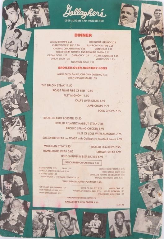 one (1) 1970's Gallagher's Steakhouse Dinner menu. Regular restaurant for New York Yankees players.