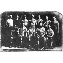 <b>1523. BASEBALL TINTYPE </b>Early baseball tintype photograph, 3 1/2" x 2 1/2 showing nine uniformed players with initials "F.H.S." on their shirts, four seated with five standing, a bat and gloves laid before them. Three others are in the image, likely coaches or trainers. Image a bit dark but otherwise clean and attractive. <b>$300-400</b>