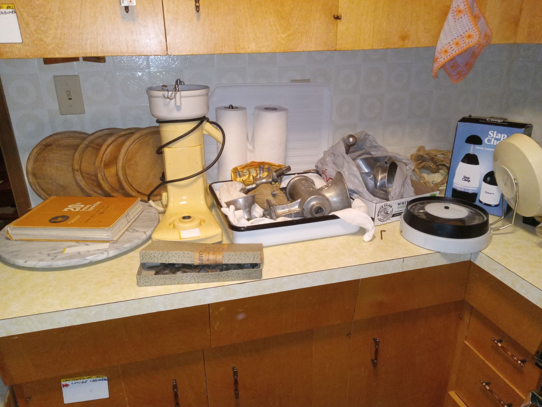 BASEMENT KITCHEN COUNTER TOP (LEFT SIDE): MEAT GRINDER, SCALE, SLAP-CHOP; TOASTERS, GEORGE FORMAN GRILL, TYPING BOOK.