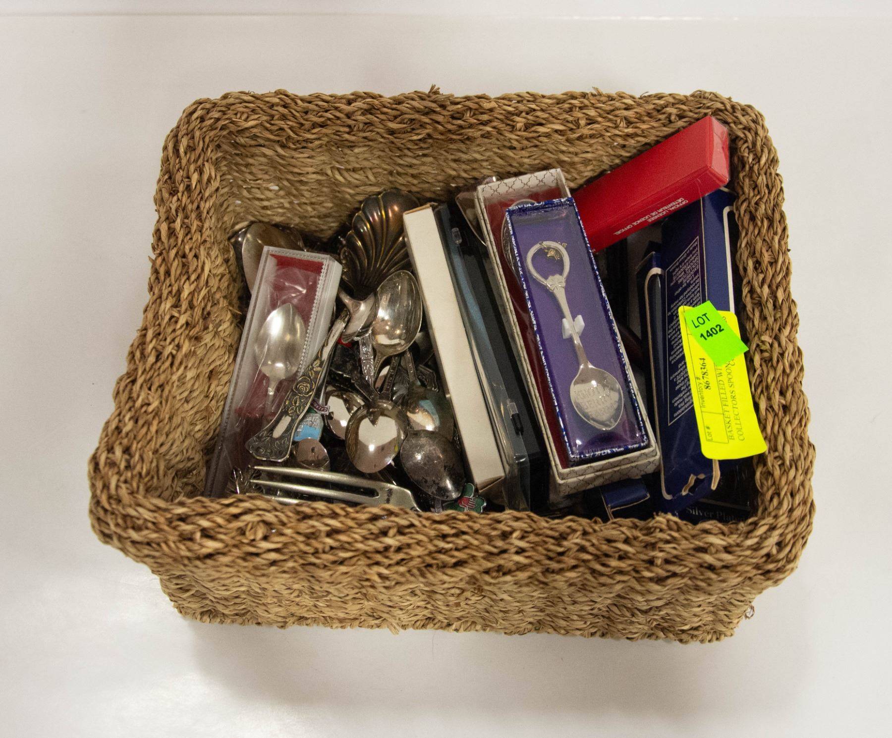 BASKET FILLED WITH VINTAGE COLLECTORS SPOONS