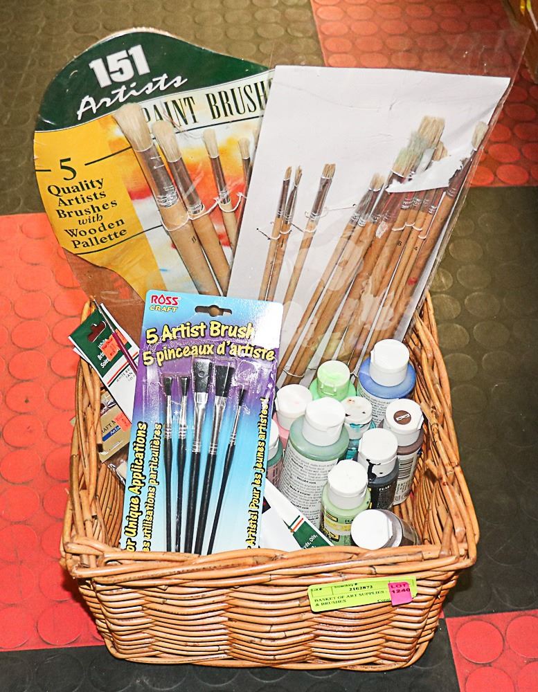 BASKET OF ART SUPPLIES - PAINTS & BRUSHES