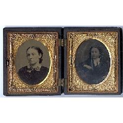 Pair of nice ambrotypes of mother and daughter, their faces turned the same way. Area of roughness about ¼” at top right edge of back and at that corner, and elsewhere along these back edges. One cover corner not sharp