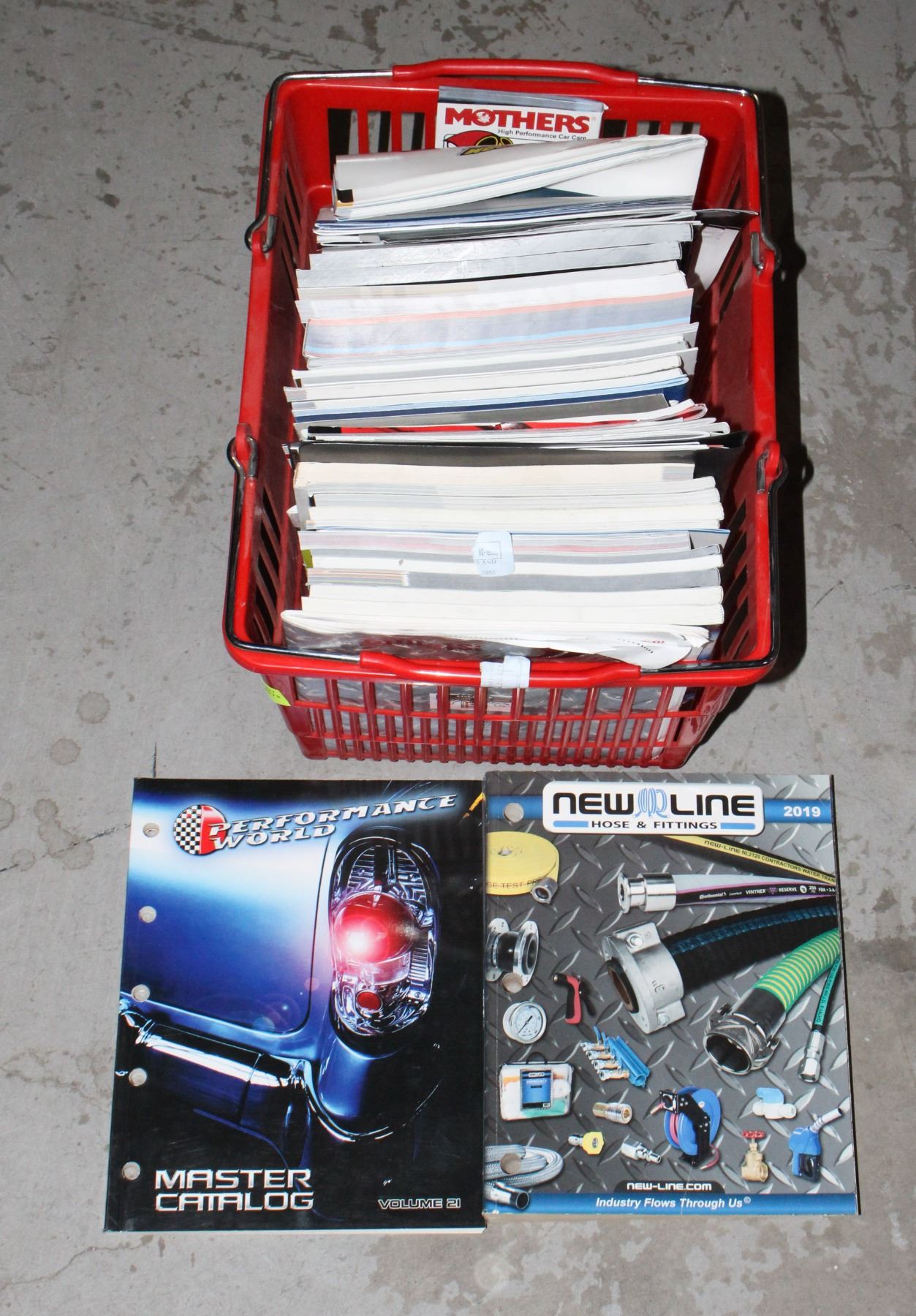 BASKET OF PARTS MANUALS AND AUTOMOTIVE BOOKS