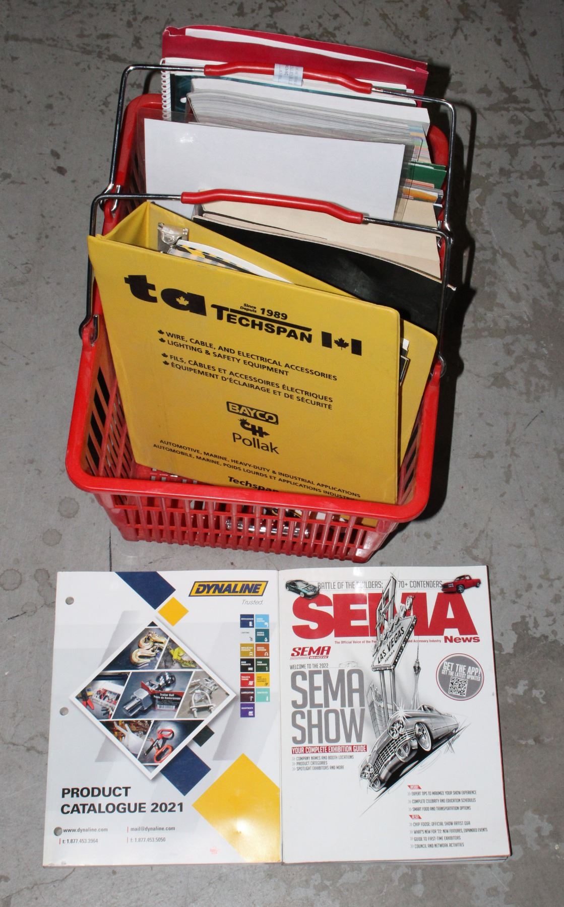 BASKET OF PARTS MANUALS AND AUTOMOTIVE BOOKS