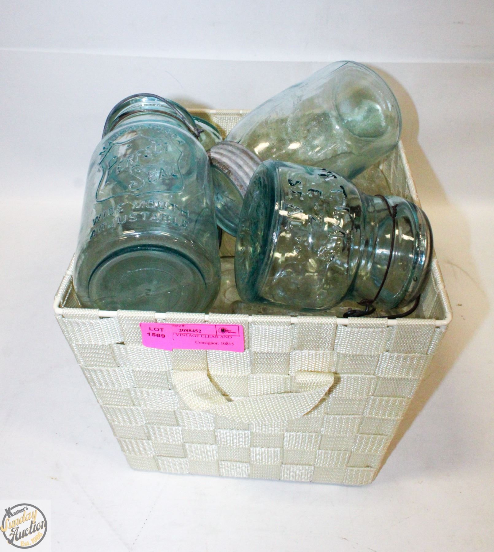 BASKET OF VINTAGE CLEAR AND BLUE JARS