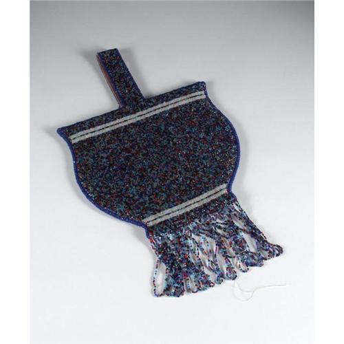 BEADWORK: Double sided basket-shape flat handbag covered in multicolored semi-faceted glass seedbeads, white strip at top, lined in pink cotton fabric, beaded fringe. Note absent fringe strands. Circa 1930. 14'' H sans fringe
