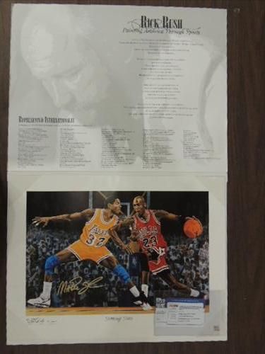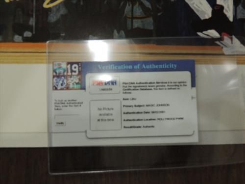21X16 BASKETBALL LITHOGRAPH SHOOTING STAR MAGIC JOHNSON AUTOGRAPH COA. INCLUDES COA FROM PSA/DNA #1A80856. ARTIST SIGNED LITHO 535/1000. AS SHOWN. VIEW PICTURE FOR DETAIL. PLEASE BE ADVISED, AND INFORMED REGARDING SIGNATURES OR AUTOGRAPHS THAT WE SELL AT AUCTION: WE ARE NOT AUTHENTICATORS, AND WE DO NOT AUTHENTICATE, OR VALIDATE ANY AUTOGRAPHS OR SIGNATURES THAT WE OFFER AT AUCTION. SOME AUTOGRAPHS OR SIGNATURES MAY COME WITH AN AUTHENTICATION FROM ANY ONE OF LITERALLY HUNDREDS OF AUTHENTICATORS ACROSS THE COUNTRY, AND AROUND THE WORLD. WE DO NOT ENDORSE ANY AUTHENTICATOR, NOR DO WE GUARANTEE THAT ANY AUTOGRAPH OR SIGNATURE IS AUTHENTIC, OR THAT IT WILL PASS AUTHENTICATION BY ANY AUTHENTICATOR. ALL AUTOGRAPHS OR SIGNATURES ARE SOLD