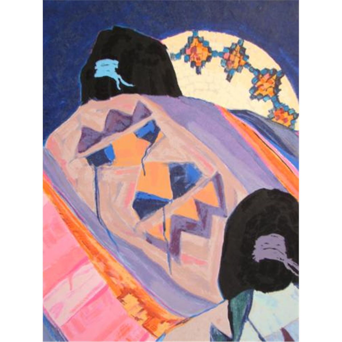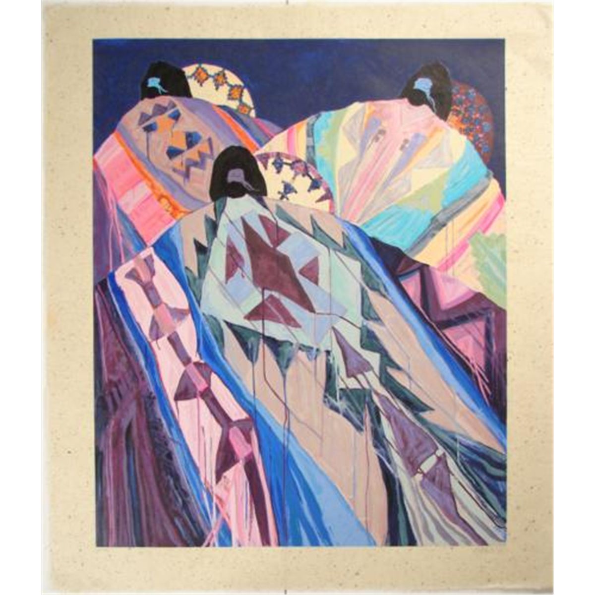 This beautifully envisioned Southwestern style fine art print on rice paper is by famous Cherokee artist Dolona Roberts: * Title: "Baskets and Blankets" * 1990 * Limited edition serigraph on rice paper * Signed and numbered from the Roman numeral edition of C (100) * 29 × 37 inches * Excellent condition; never mounted, matted or framed * Certificate of Authenticity * * Dolona Roberts, a renowned painter of Cherokee heritage, was born in Santa Fe, New Mexico in 1936. She paints in her own distinctive style that includes abstract expressionism and representational Southwest art. Roberts' trademark is her portrayal of the backs of Indian women draped in colorful and intricately designed blankets. Her paintings express the mystical quality of Pueblo Indian rituals. * Dolona Roberts' honor and accolades abound, including the Artist of the Year Award from the Santa Fean and the Prix de Paris granted by a jury of New York critics. Her paintings have been included in numerous exhibits, museum collections, and prestigious private and corporate collections. * * A wonderful addition to any collection!