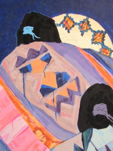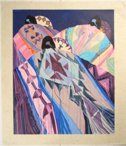 This beautifully envisioned Southwestern style fine art print on rice paper is by famous Cherokee artist Dolona Roberts: Title: "Baskets and Blankets" 1990 Limited edition serigraph on rice paper Signed and numbered from the Roman numeral edition of C (100) 29 × 37 inches Excellent condition; never mounted, matted or framed Certificate of Authenticity Dolona Roberts, a renowned painter of Cherokee heritage, was born in Santa Fe, New Mexico in 1936. She paints in her own distinctive style that includes abstract expressionism and representational Southwest art. Roberts' trademark is her portrayal of the backs of Indian women draped in colorful and intricately designed blankets. Her paintings express the mystical quality of Pueblo Indian rituals. Dolona Roberts' honor and accolades abound, including the Artist of the Year Award from the Santa Fean and the Prix de Paris granted by a jury of New York critics. Her paintings have been included in numerous exhibits, museum collections, and prestigious private and corporate collections. A wonderful addition to any collection!
