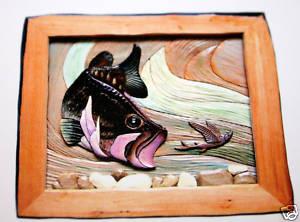 "BASS" - 18X16 - HAND CARVED - HAND STAINED - MADE OF MANY DIFFERENT HIGH QUALITY WOODS - WELL MAINTAINED - QUALITY