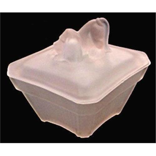 Known as Basset Hound the finial on the lid of this diamond shaped powder jar features a playful Basset Hound puppy. Shown on pg 17 of Whitmyer - Bedroom & Bathroom Glassware of the Depression Years. The tapered Art Deco base is footed. Produced in pink satin glass and measuring about 4 1/4 inches tall x 5 1/2 inches long. With the exception of minor roughness under the rim of the jar and lid, both the jar and lid are in excellent condition.