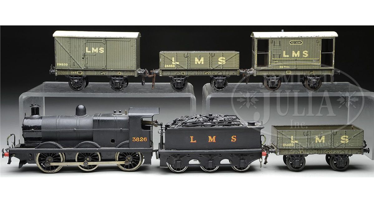 A nice example of an 0-6-0 English outline L.M.S. engine tender, 2 box cars and 2 gondola cars in "O" gauge scale. Engine & tender appear to have aged repainting, however extremely well done. Lithograph cars are in very nice original finish. SIZE: Overall length of train 36". CONDITION: As stated above. 1-13338