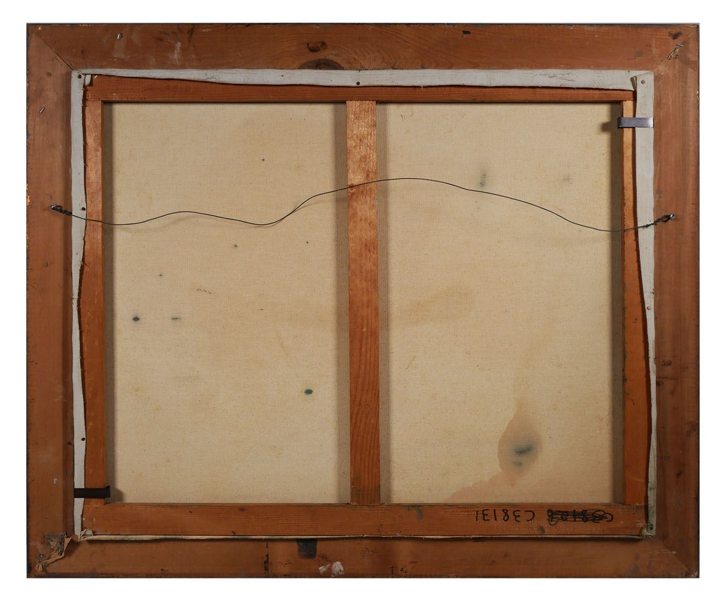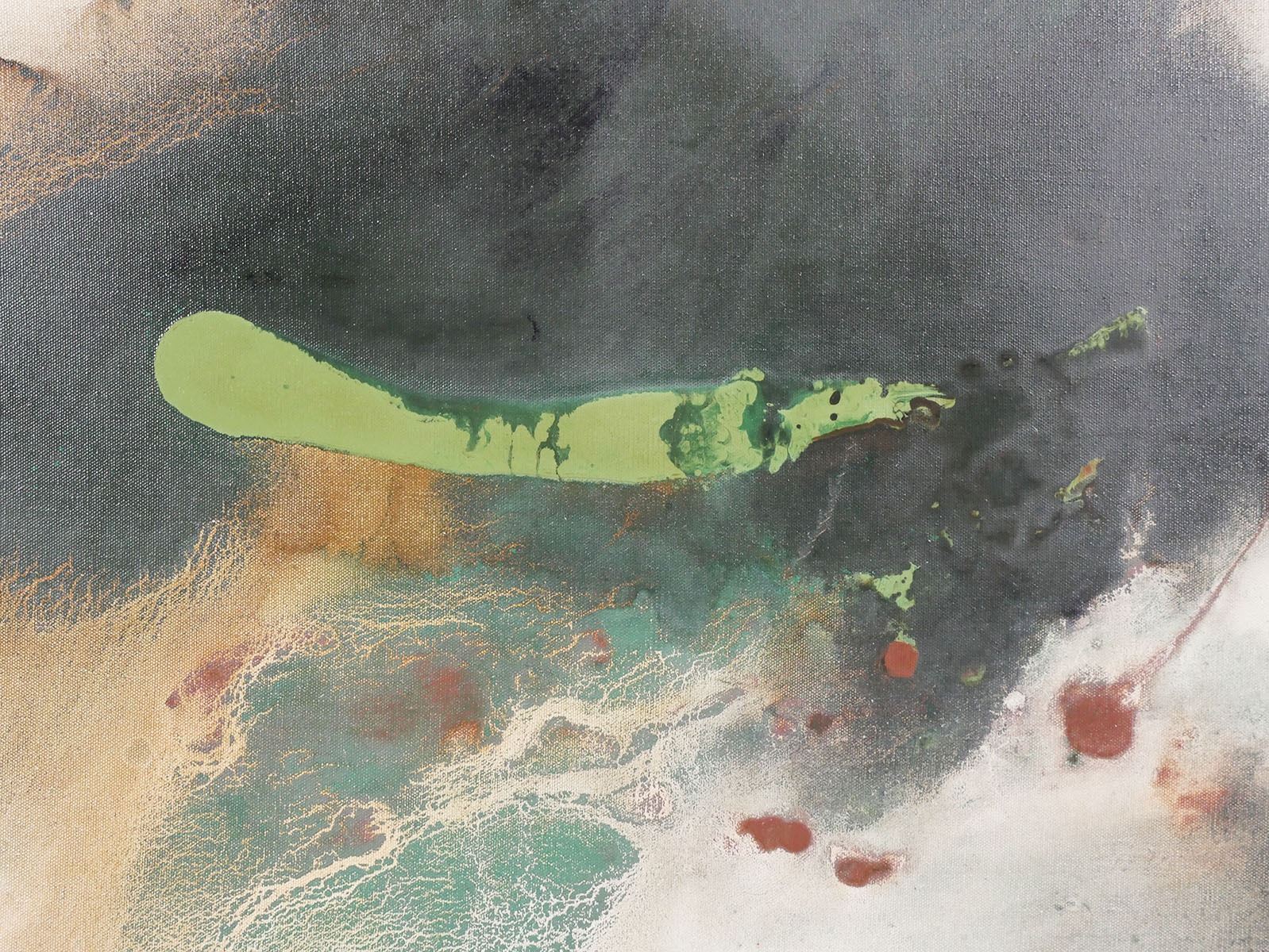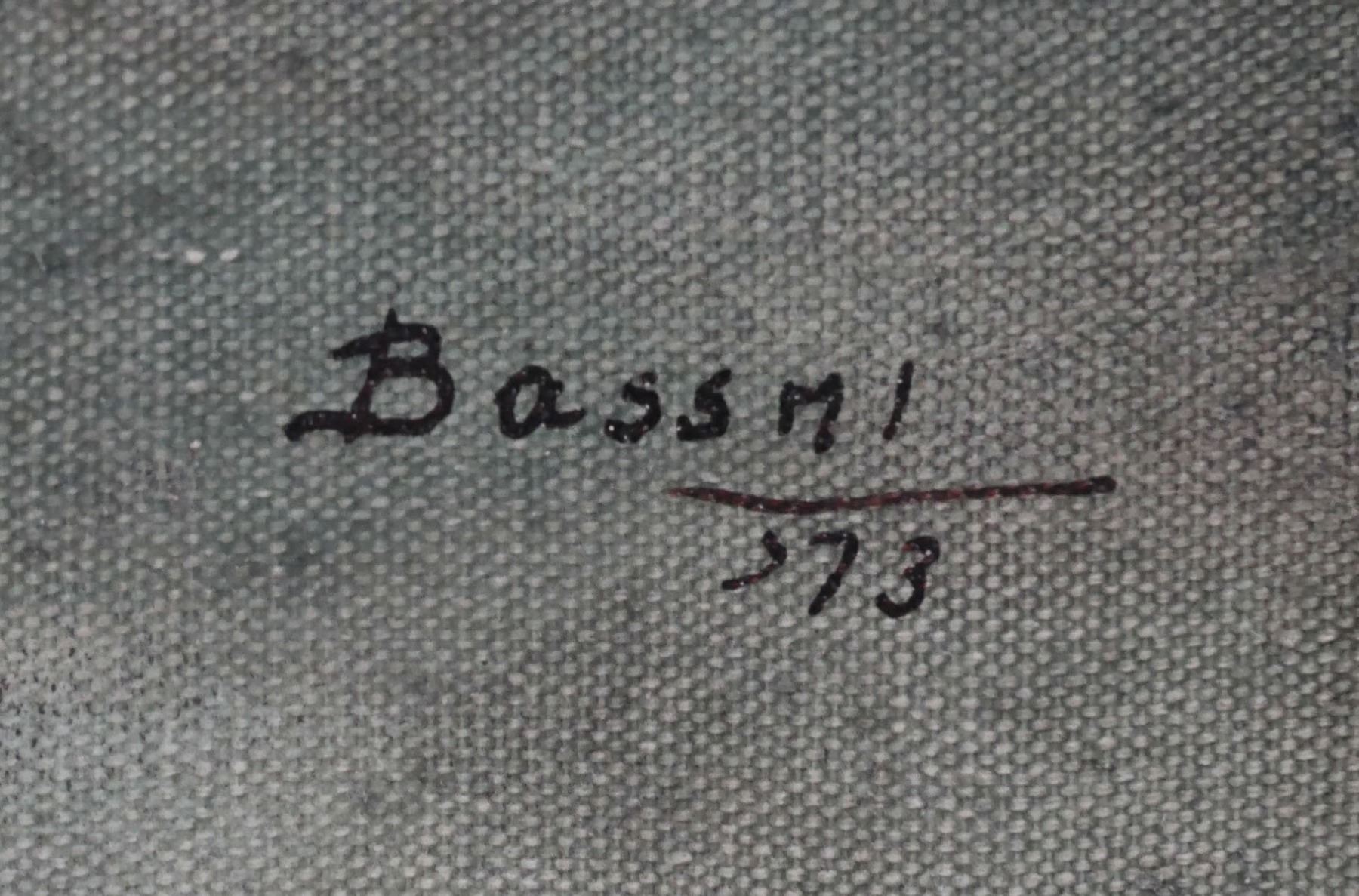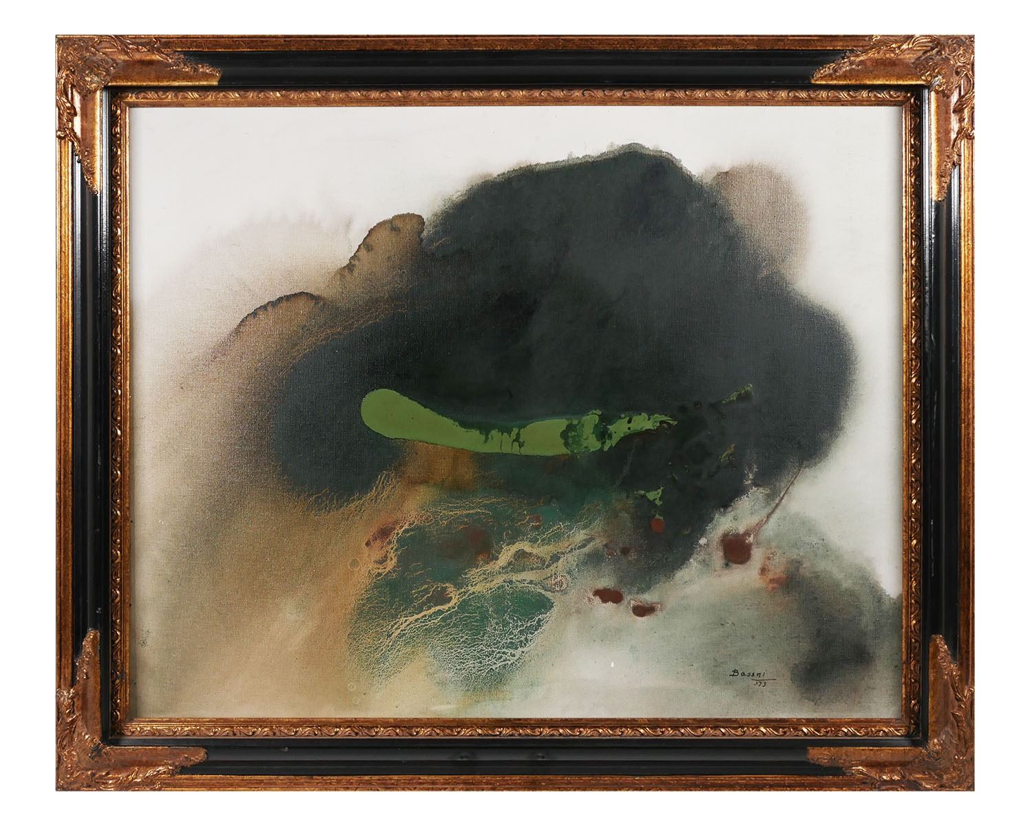 Large abstract oil on canvas painting by Bassmi M. Ibrahim (Egyptian/American, 1941-2019). Signed lower right and dated to 1973. Overall framed size is 35" x 29". Excellent condition.
