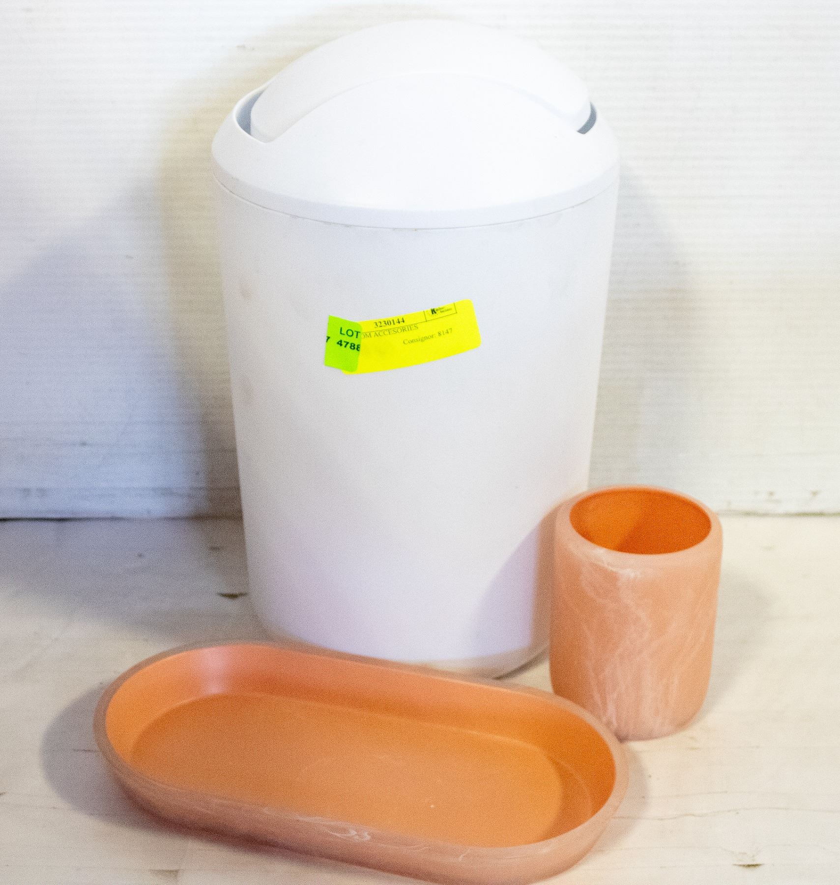 GOOD USED CONDITION-SMALL WHITE GARBAGE CAN WITH MATCHING MARBLED TOOTBRUSH HOLDER AND TRAY(LOT OF 3)