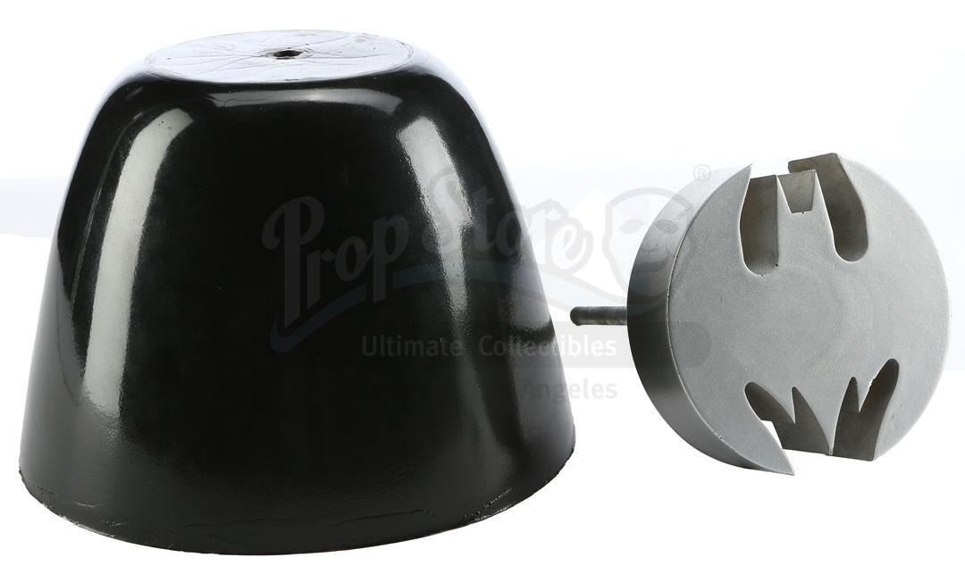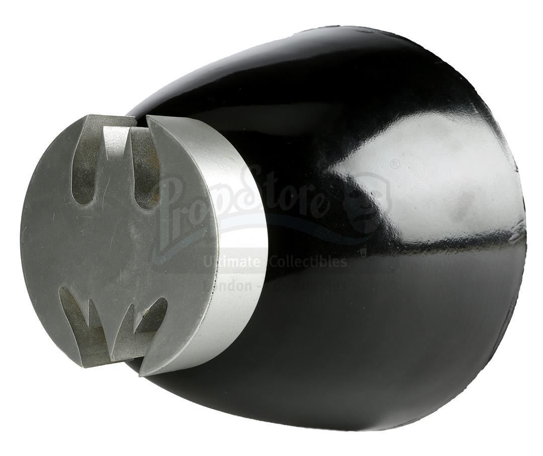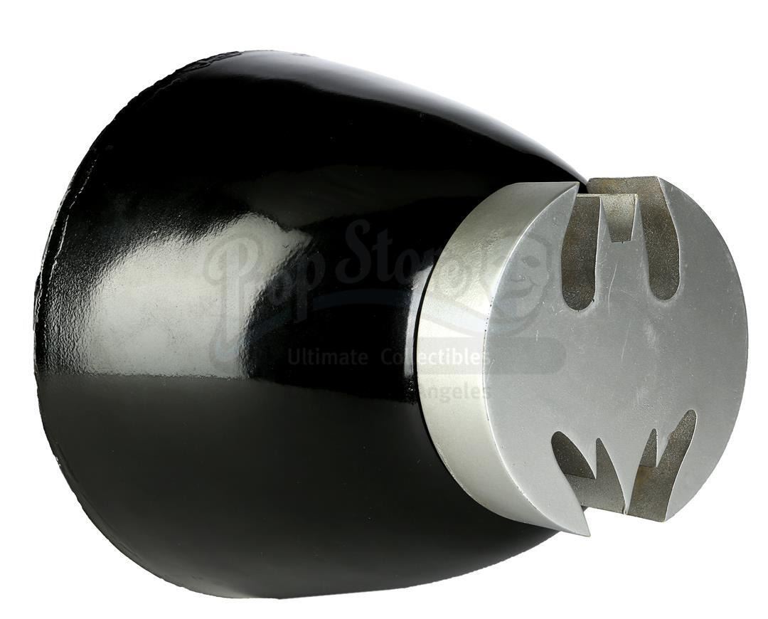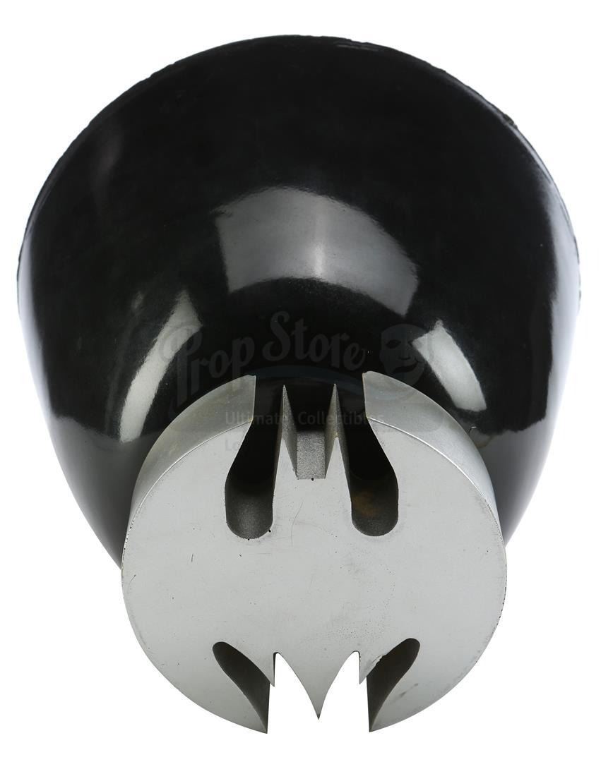 This dome-shaped black fibreglass hubcap features a small hole at the centre of the top and a metal-coloured resin bat symbol with a metal screw on the bottom which can be inserted into the hubcap section. It is in good overall condition with signs of wear from production including some indentations and cracking on the top of the fibreglass element. Dimensions: 24 cm x 24 cm x 17 cm (9 1/2" x 9 1/2" x 6 3/4")