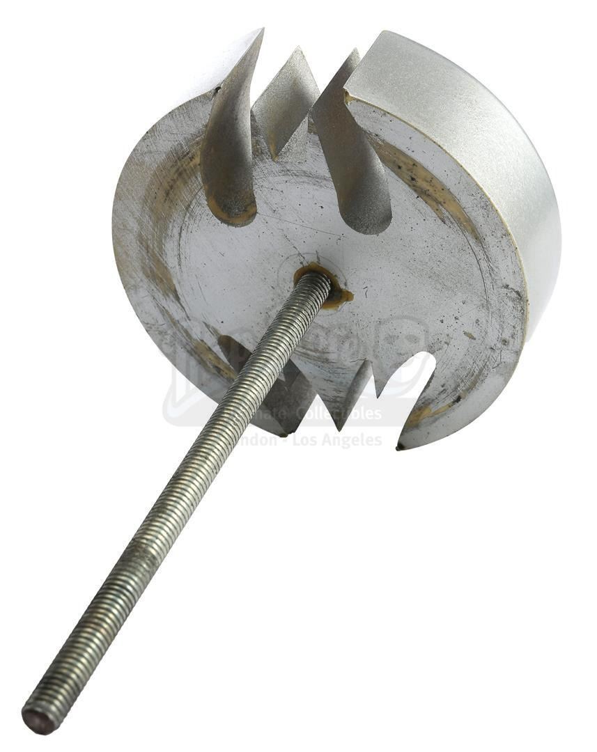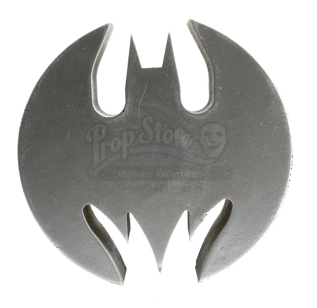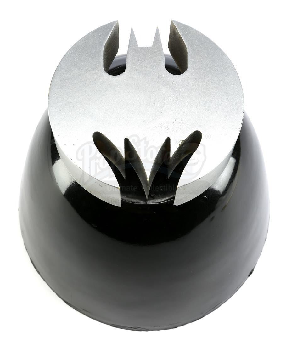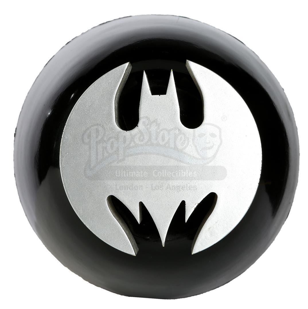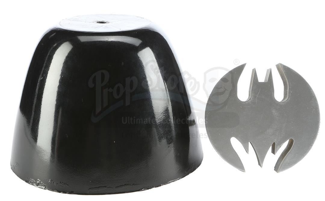 A Batmobile hubcap from Tim Burton's superhero film Batman. The legendary vehicle, synonymous with the titular hero (Michael Keaton), was created by Academy Award-winning production designer Anton Furst and featured during the film's chase sequence. Seven complete sets of bat-shaped hubcaps are thought to have been made, with this specific piece having originally come directly from a technician on the film.