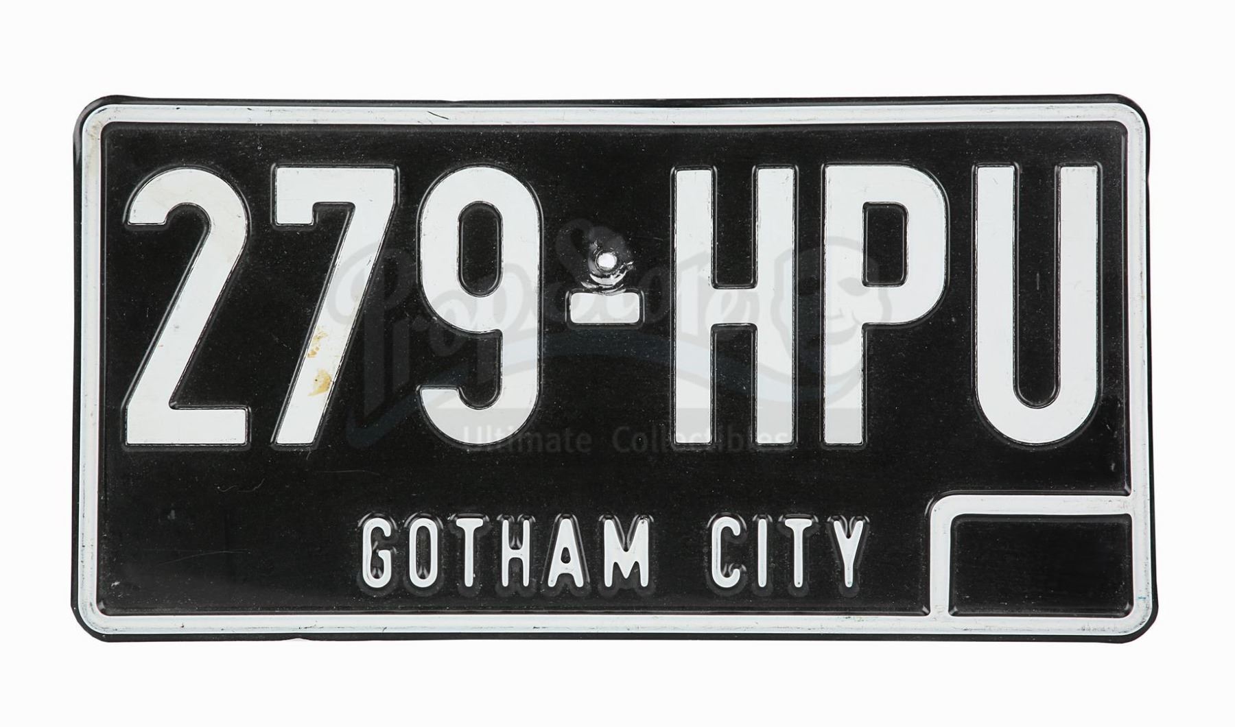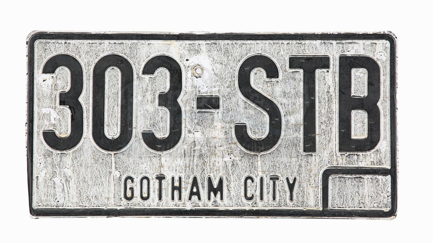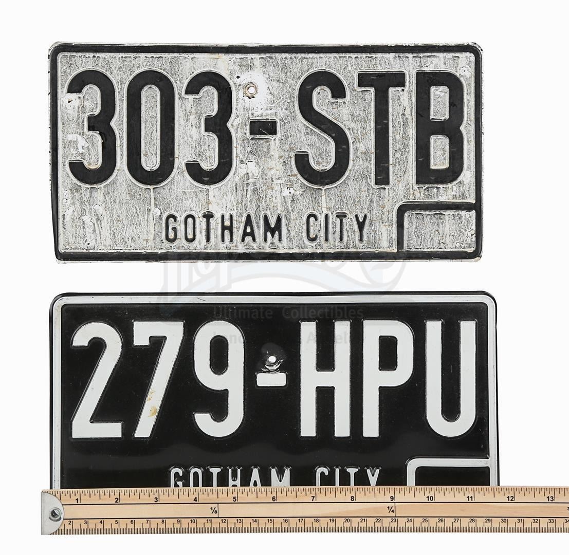 Constructed from lightweight metal, the black plate features "Gotham City'' across the bottom and displays the numbers "279-HPU" finished in white paint. The lot also includes an additional licence plate, painted white, with black text reading "303-STB, Gotham City". Both items display intentional screw holes and minor paint wear, and the white plate is intentionally distressed to appear used. Dimensions (each): 15.5 cm x 30.5 cm (6" x 12")