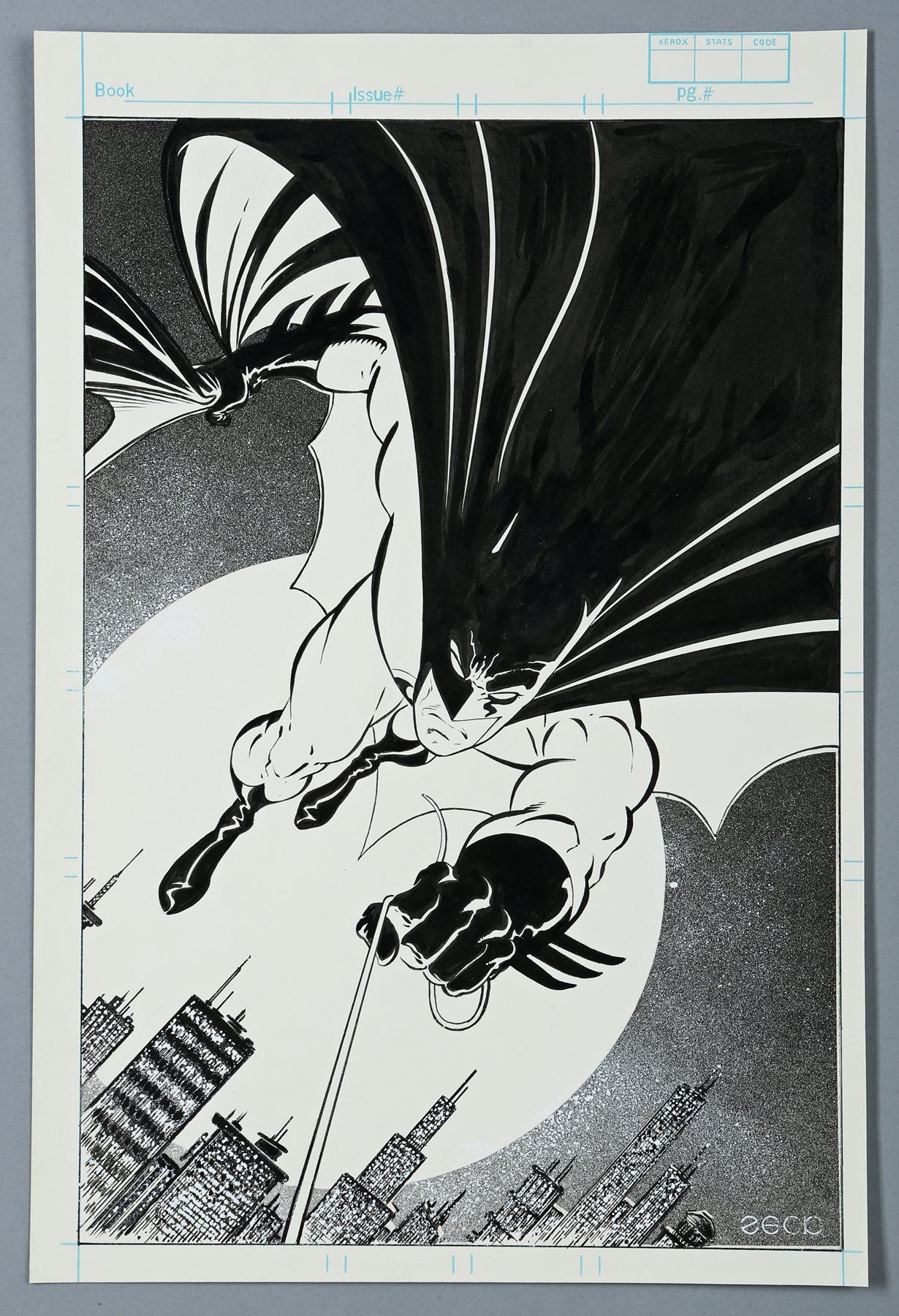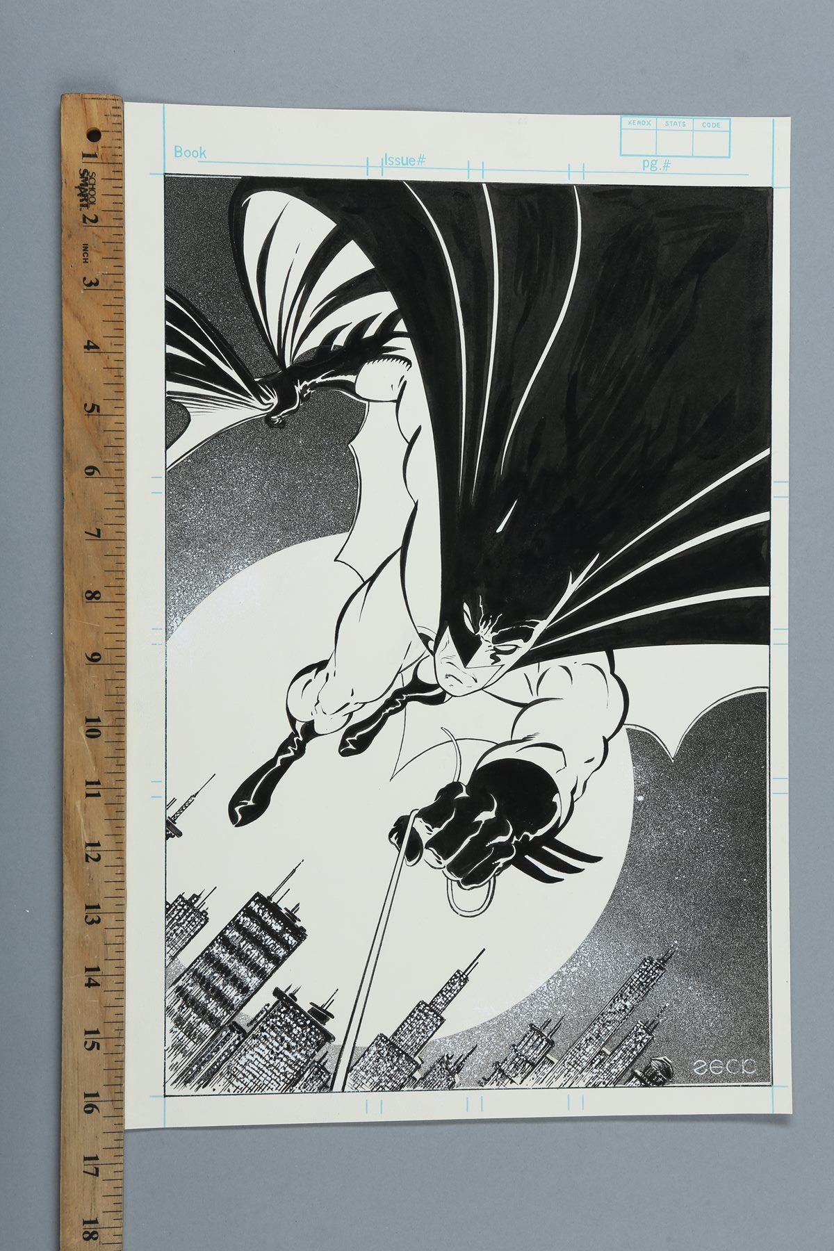 This original pencilled-and-inked pin-up is drawn on Bristol board by renowned artist Mike Zeck (Captain America, The Punisher, Spider-Man). The artwork shows Batman gliding above Gotham City with his Batrope. The back of the sheet shows two DC Comics stamps and Mike Zeck’s name. This art was featured in an exhibit of Mike Zeck’s art titled “Dynamic Lines” at the University of Maryland Eastern Shore in 2015 and was used as the poster art for the exhibit.