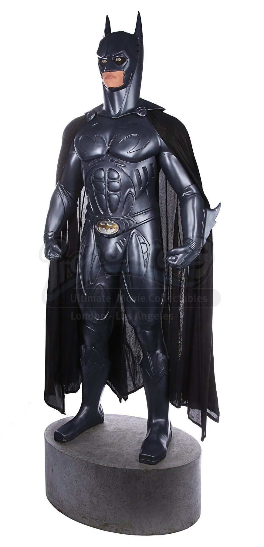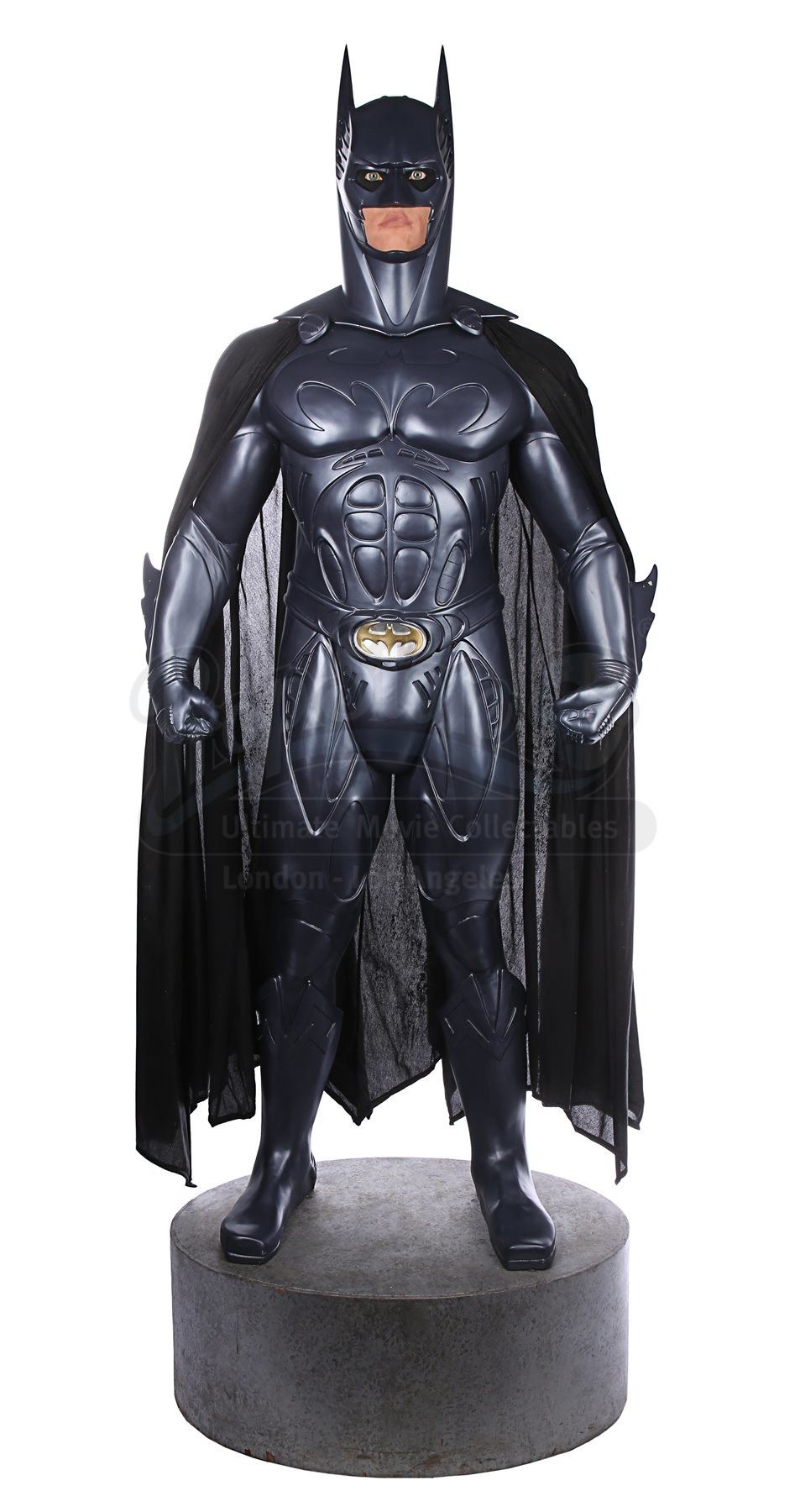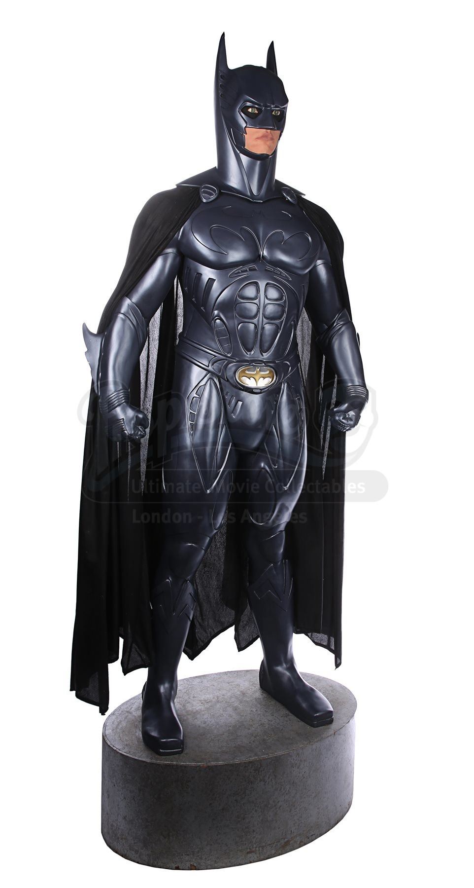 A full-scale, limited-edition, licensed replica Batman statue sold during the release of Joel Schumacher's superhero sequel Batman Forever. Dressed in the muscular Bat-Suit, the caped crusader here features the likeness of actor Val Kilmer behind the mask.