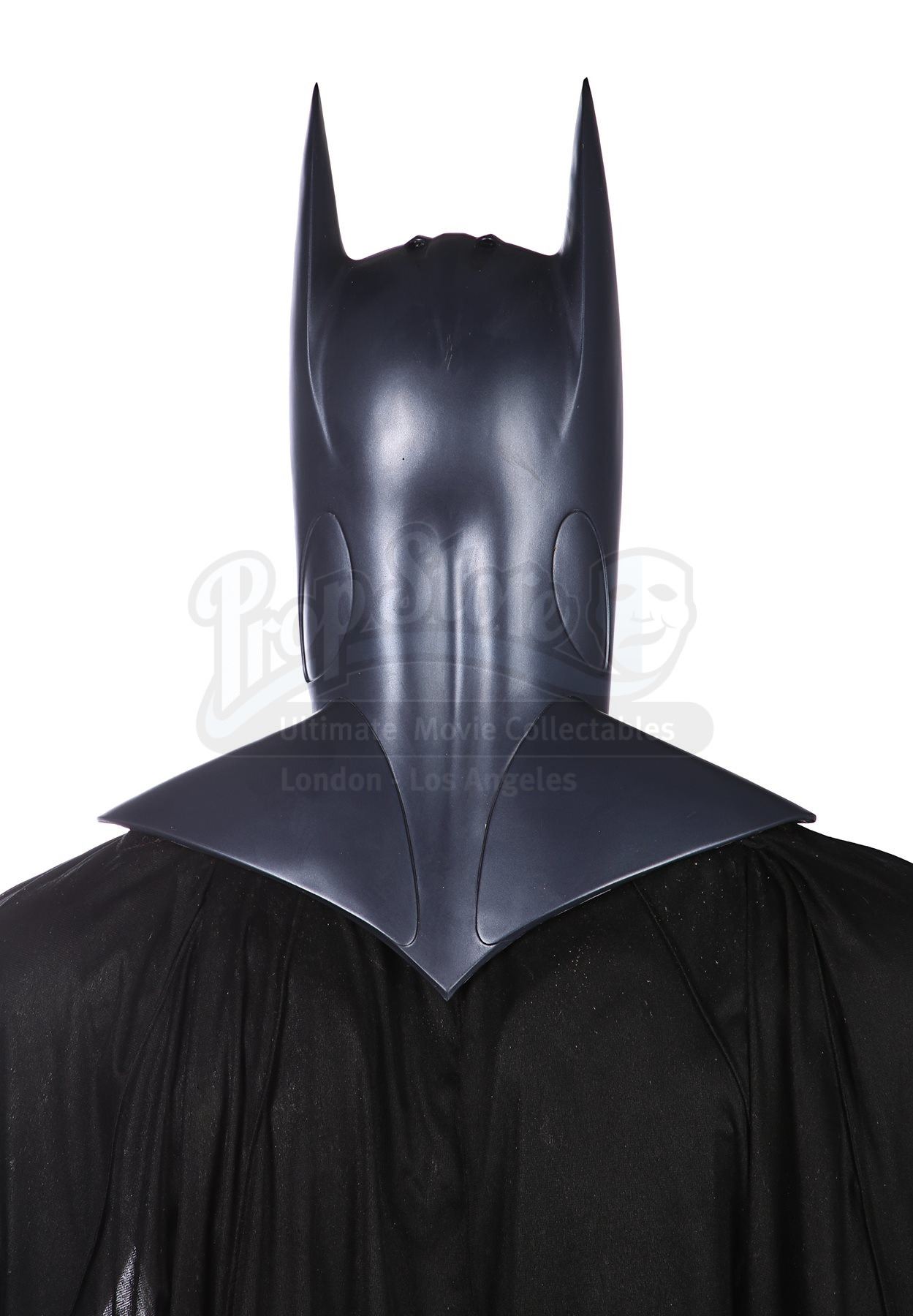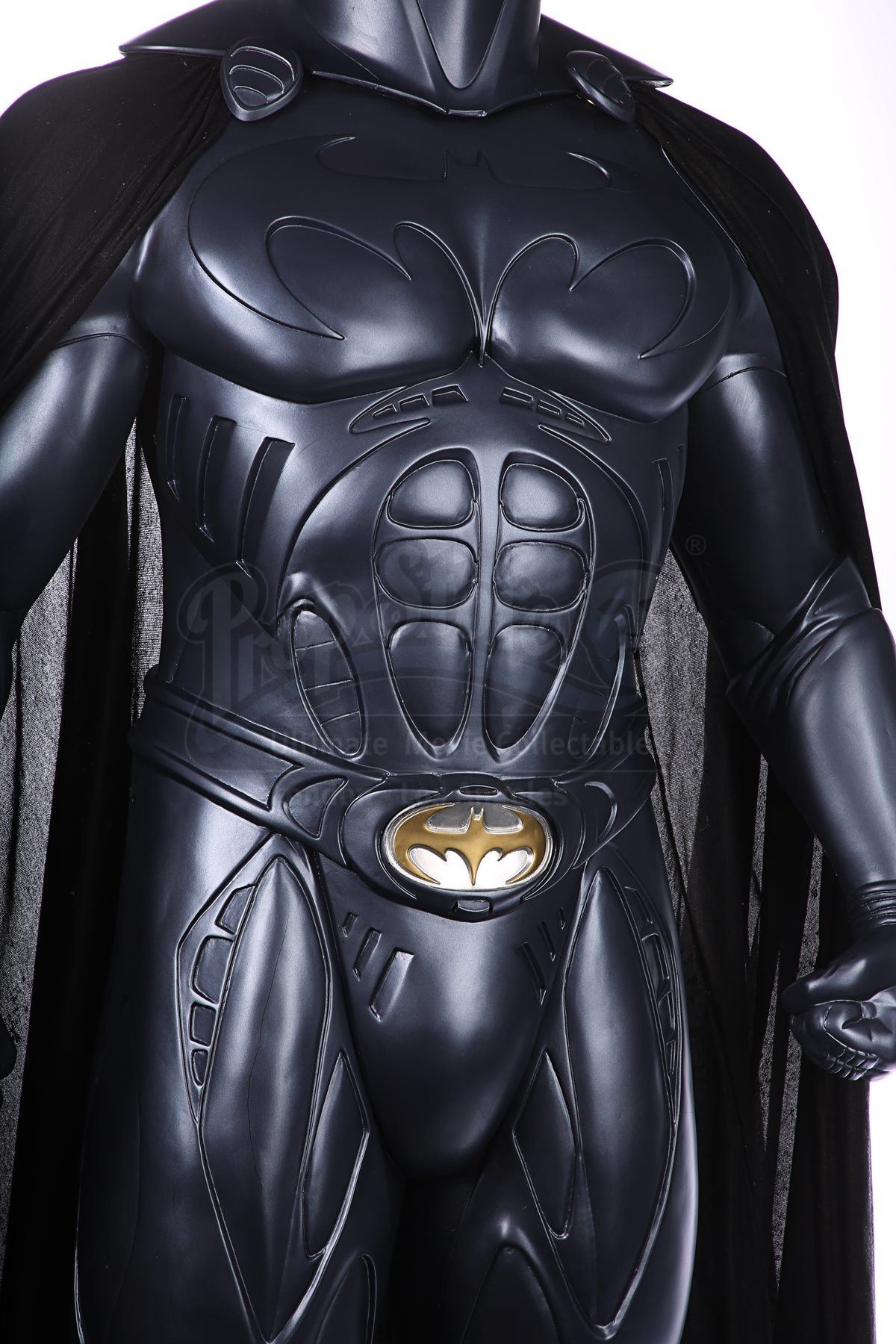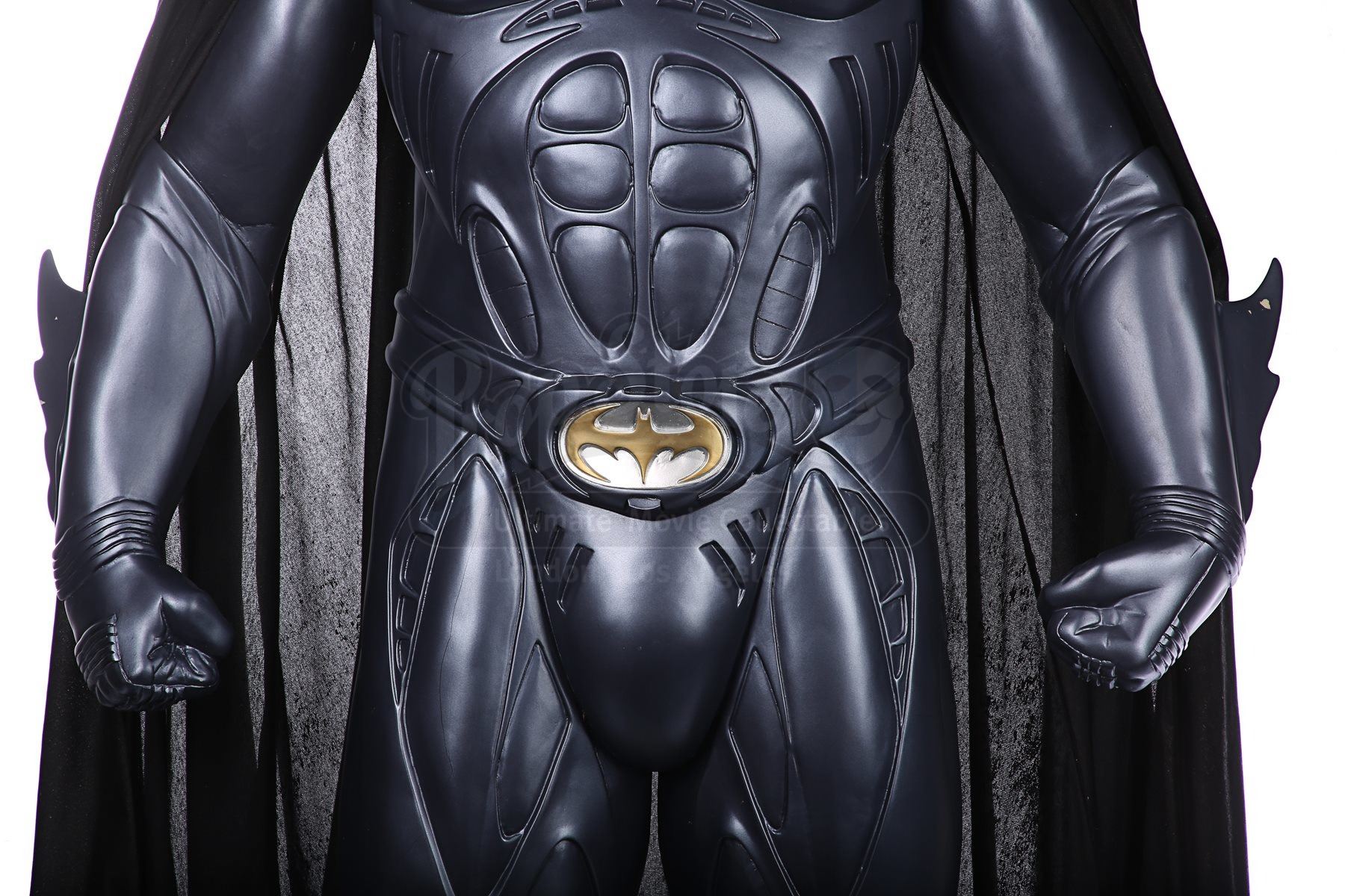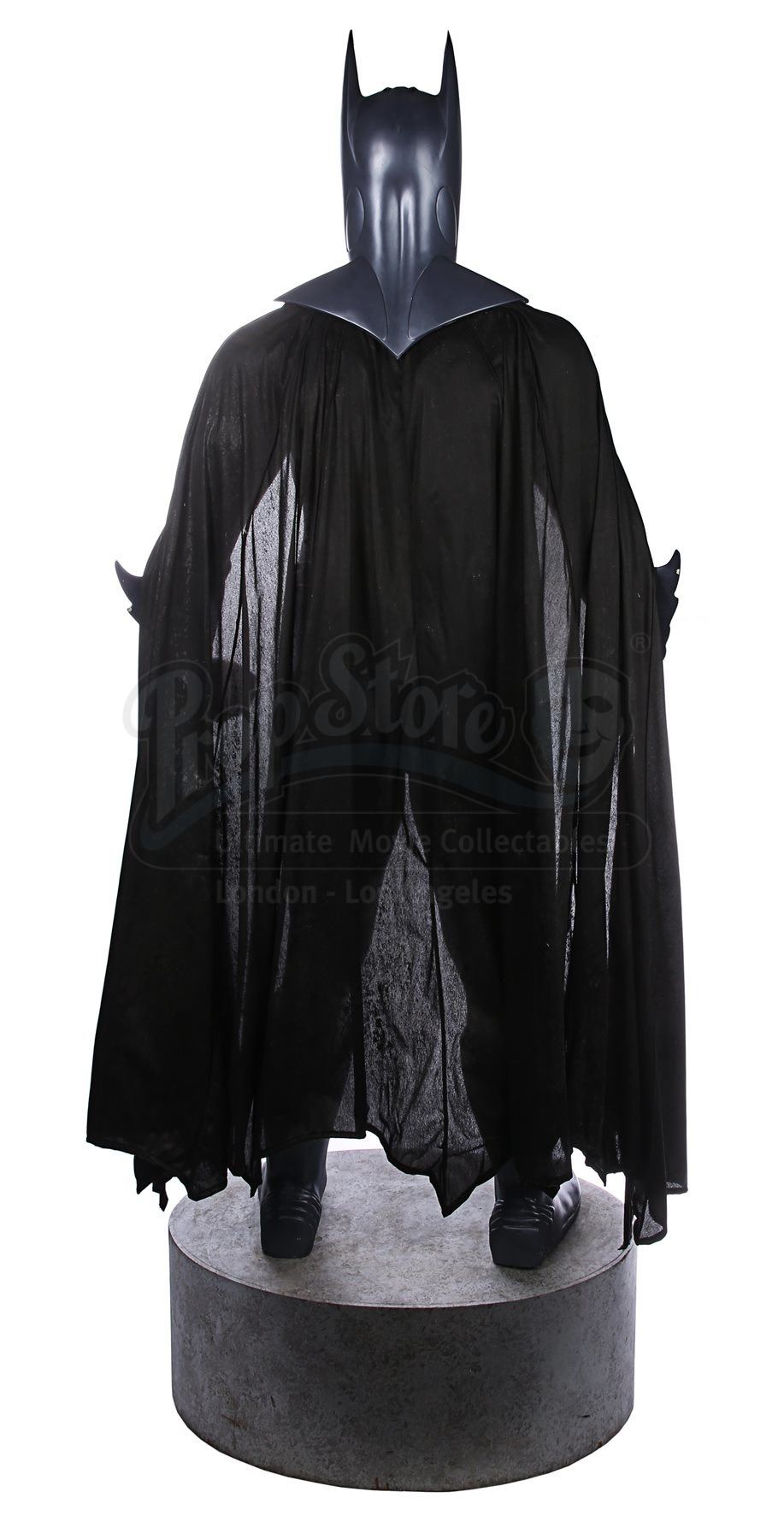 The statue is made of fibreglass and resin with a metal-rod internal support. The Bat-Suit is painted metallic blue, and the black polyester cape’s hem incorporates rods to ensure it hangs correctly and is distressed to look well used. The statue is presented on a wood and fibreglass base that’s painted grey and supported by metal rods via the feet. Dimensions: 50 cm x 90 cm x 205 cm (19 ¾” x 35 ½” 80 ¾”)