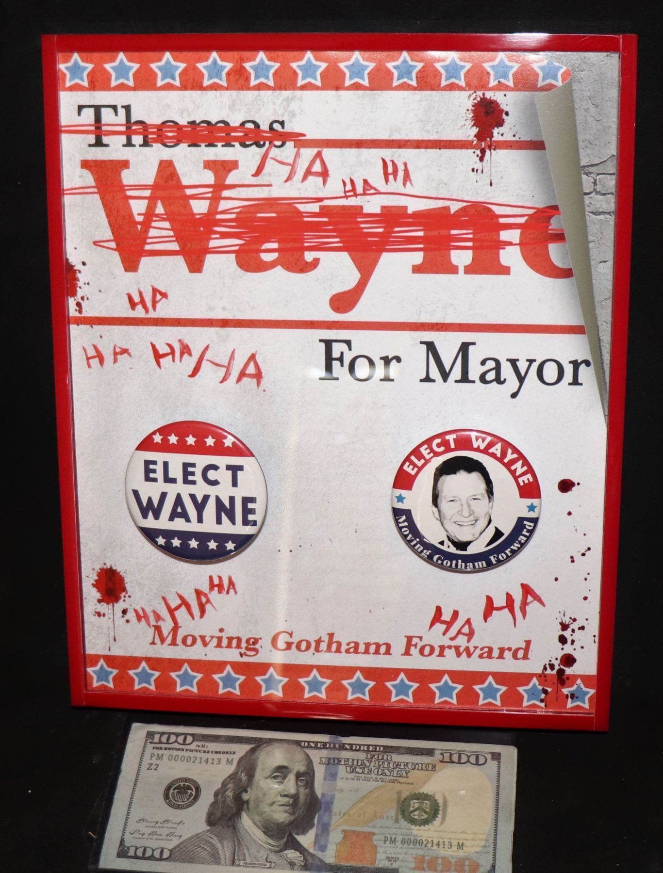 BATMAN JOKER PAIR OF THOMAS WAYNE POLITICAL BADGES ON NICE DISPLAY!