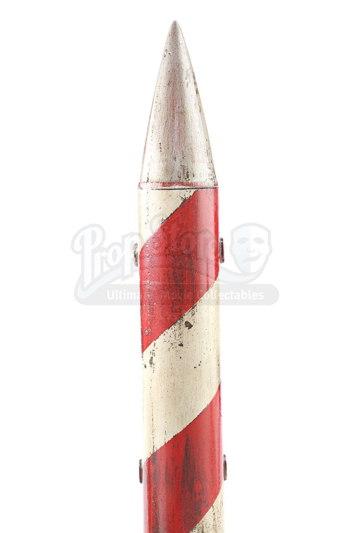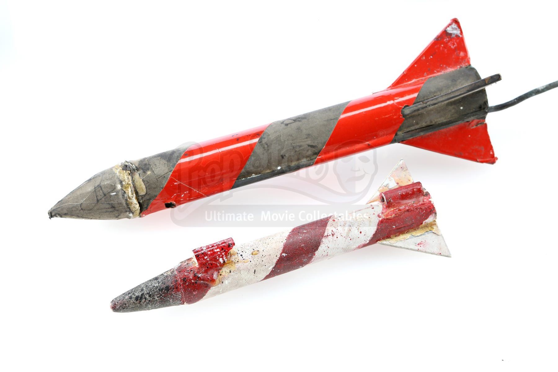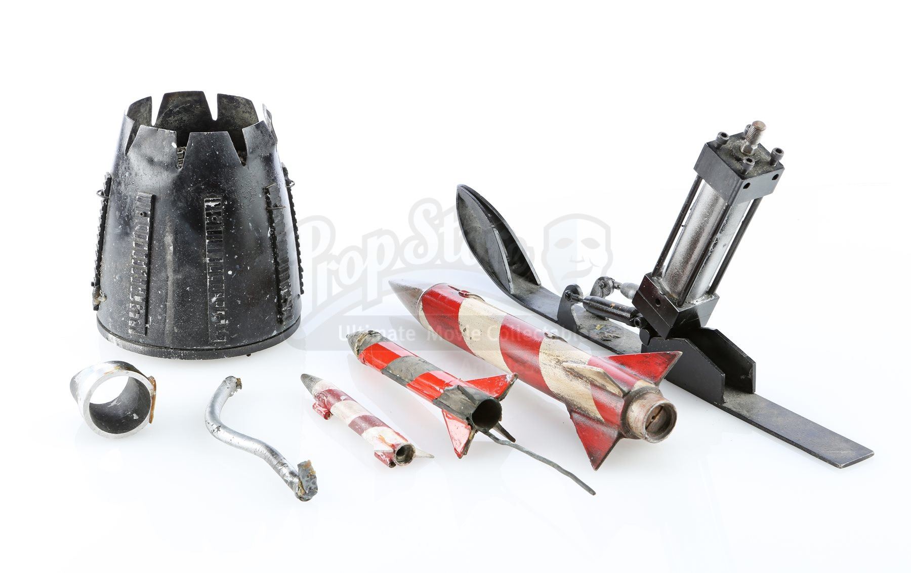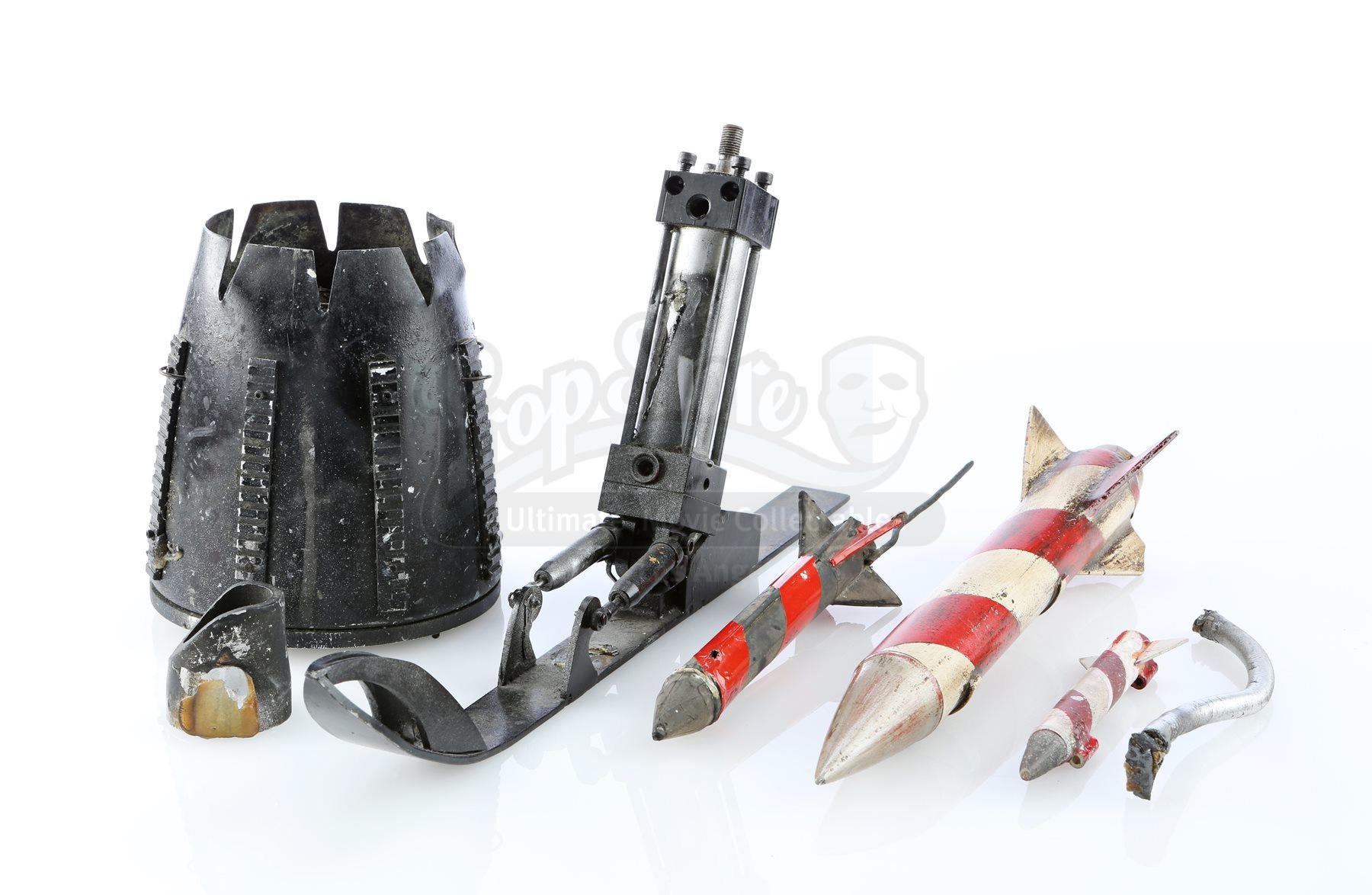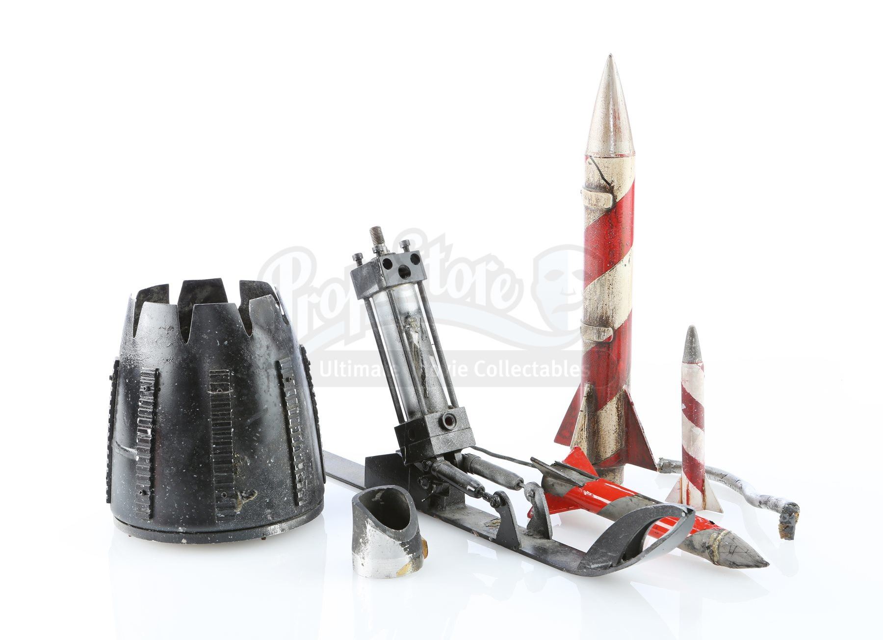 The flame cannon was outfitted on the back of the Batmobile and the Batskiboat model miniatures, and was used to project controlled fire. The Batskiboat landing foot was never used on screen, though it was seen on officially licensed toys.Also included are a full-size dense foam rocket, and two smaller-scale practical metal rockets from the Batskiboat sewer sequence . The largest rocket shows a small break in one of the stabilizer fins, and the smallest rocket is missing one stabilizer fin. The lot remains in fine condition. Dimensions (flame cannon): 15 cm x 15 cm x 16 cm (5 ¾” x 5 ¾” x 6 ¼”); (landing foot): 42 cm x 4.5 cm x 20 cm (16 ½” x 1 ¾” x 7 ¾”); (largest rocket): 32 cm x 7 cm x 7 cm (12 ½” x 2 ¾” x 2 ¾”)