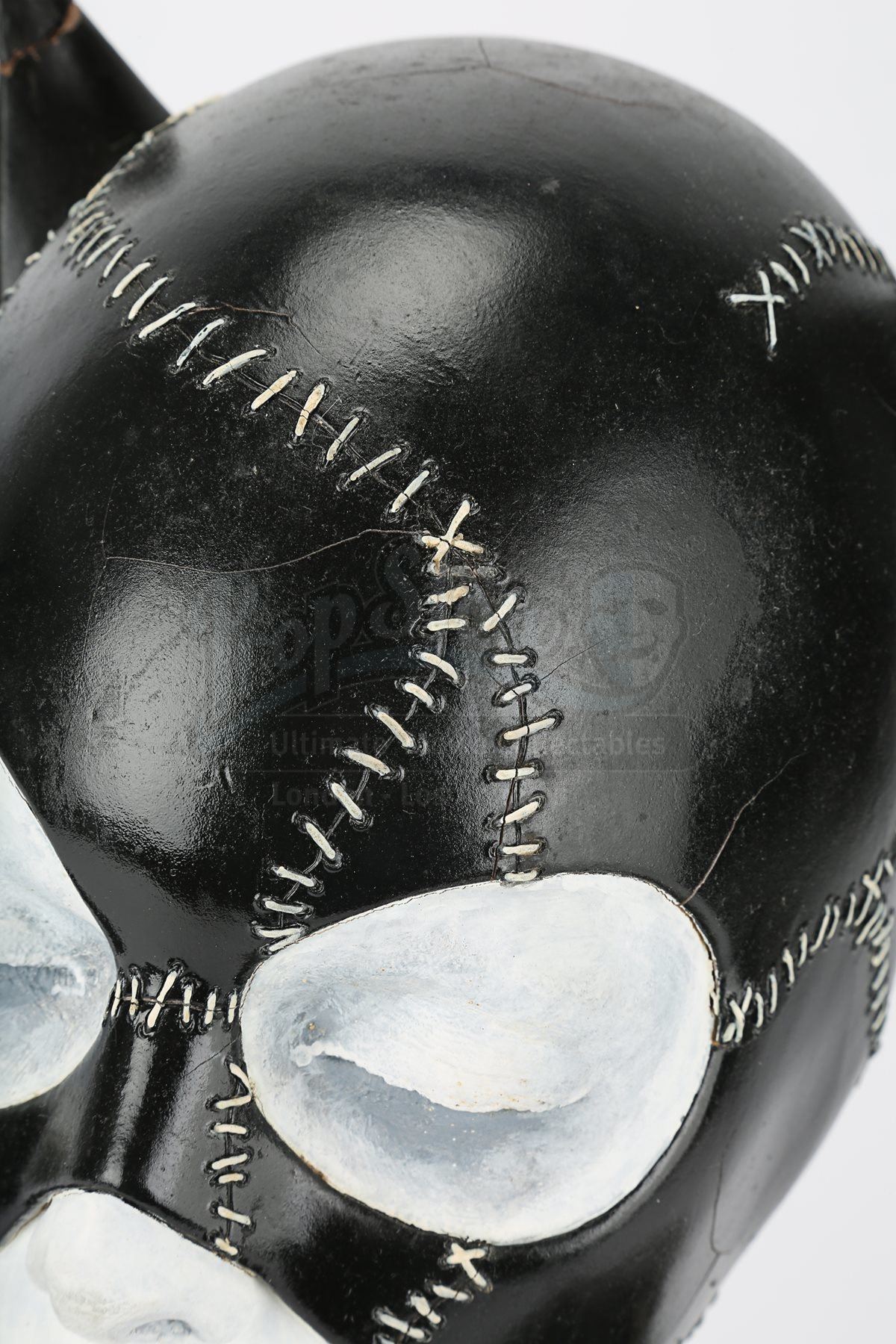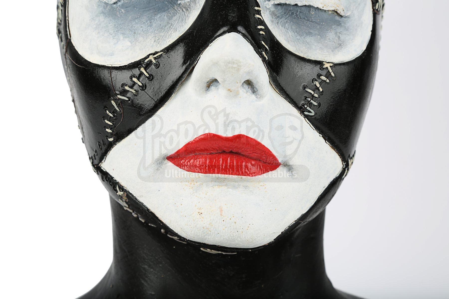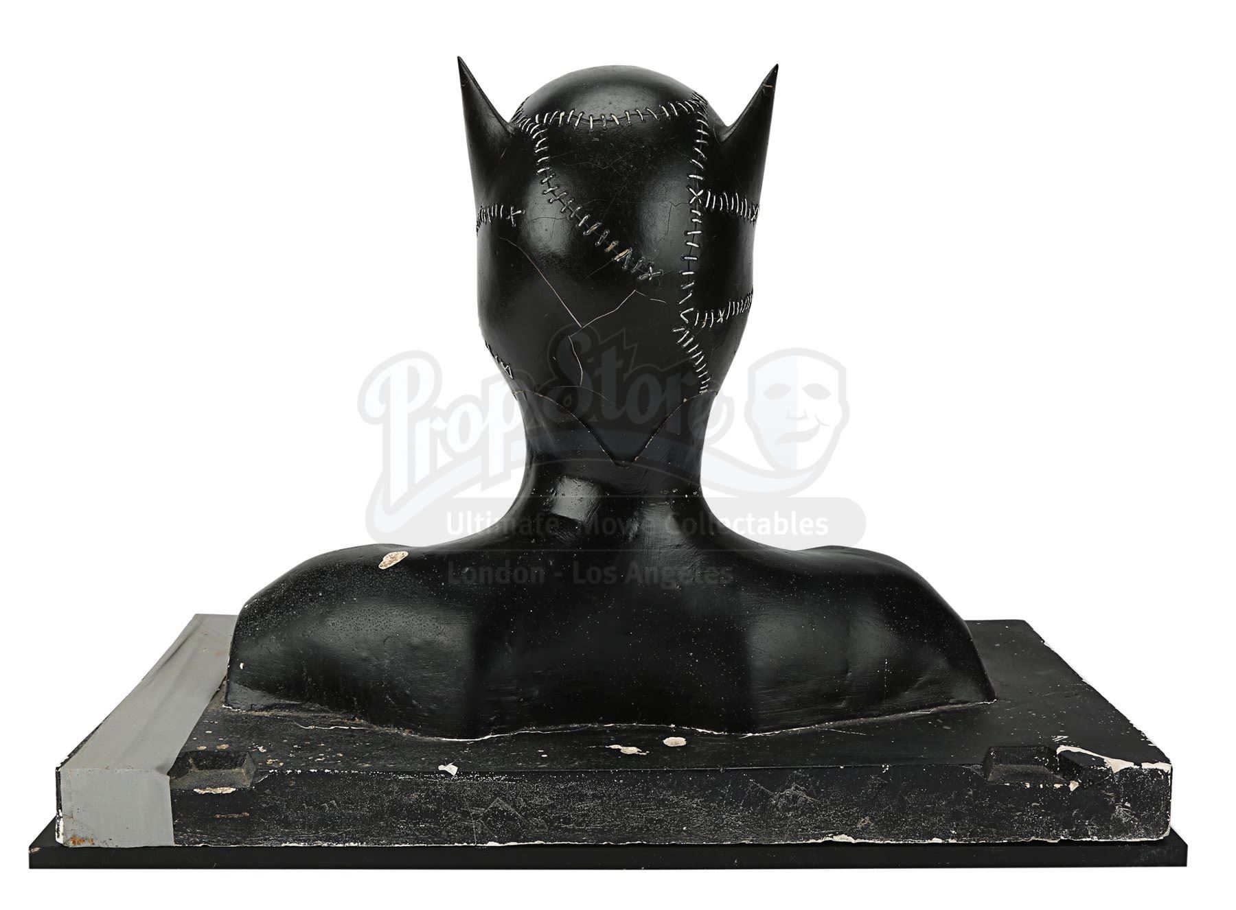 Inspired by a German sculpture of a patchwork-like woman’s head and shoulders, this lifelike clay bust was sculpted by Jose Fernandez and painted by costume designer Bob Ringwood for the approval of the director. This concept was approved. The white-painted facial area features bright red lip colouring and darkened eye sockets. This bust is presented on a custom-made black wood display. Minor paint cracks and wear show on the cowl from production use, with further holes and marks around the base. The right ear shows signs of repair. Dimensions: 32 cm x 61 cm x 42 cm (12 ½” x 24” x 16 ½”)