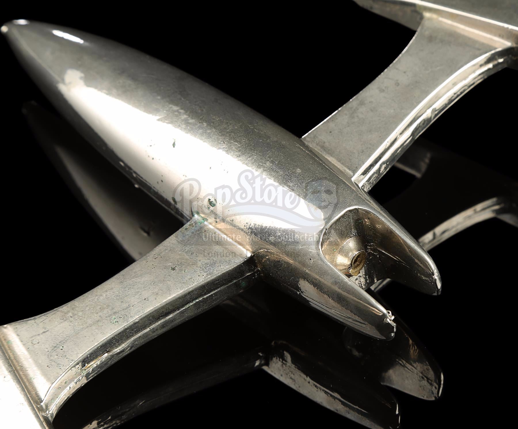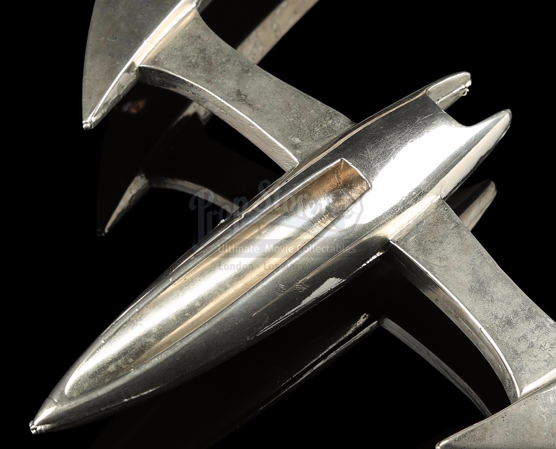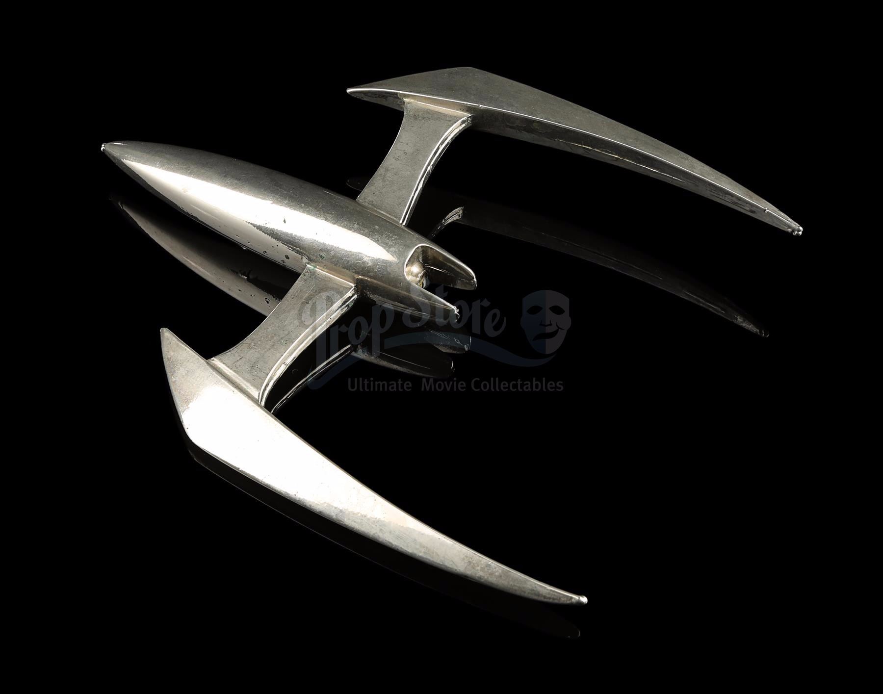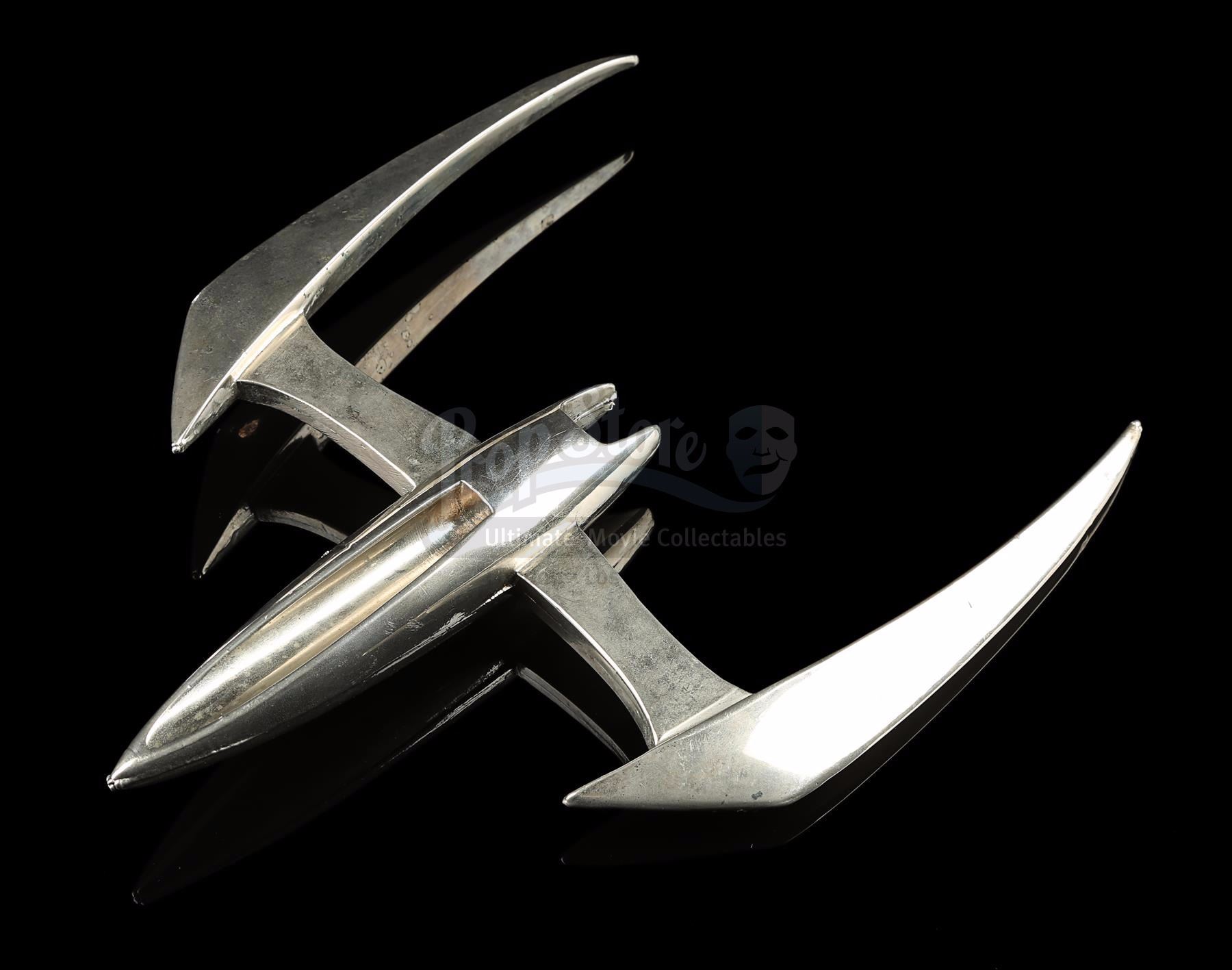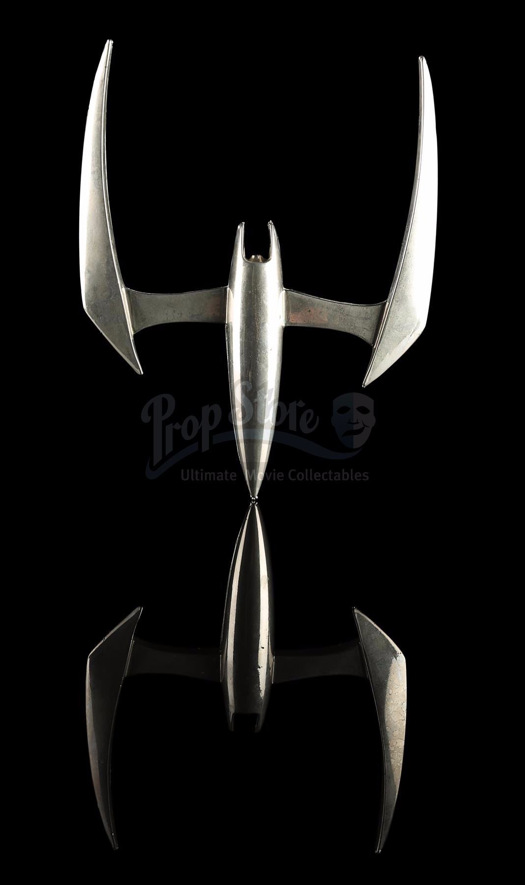 Made of chrome-plated resin, the grappling hook is shaped like a bat with pointed ears and long wings. A hole has been drilled through the centre of the grappling hook, possibly for a special effect, and it displays light signs of wear, including small chips and dents to the chrome plating. Dimensions: 27 cm x 21.5 cm x 4 cm (10 3/4'' x 8 1/2'' x 1 3/4'')