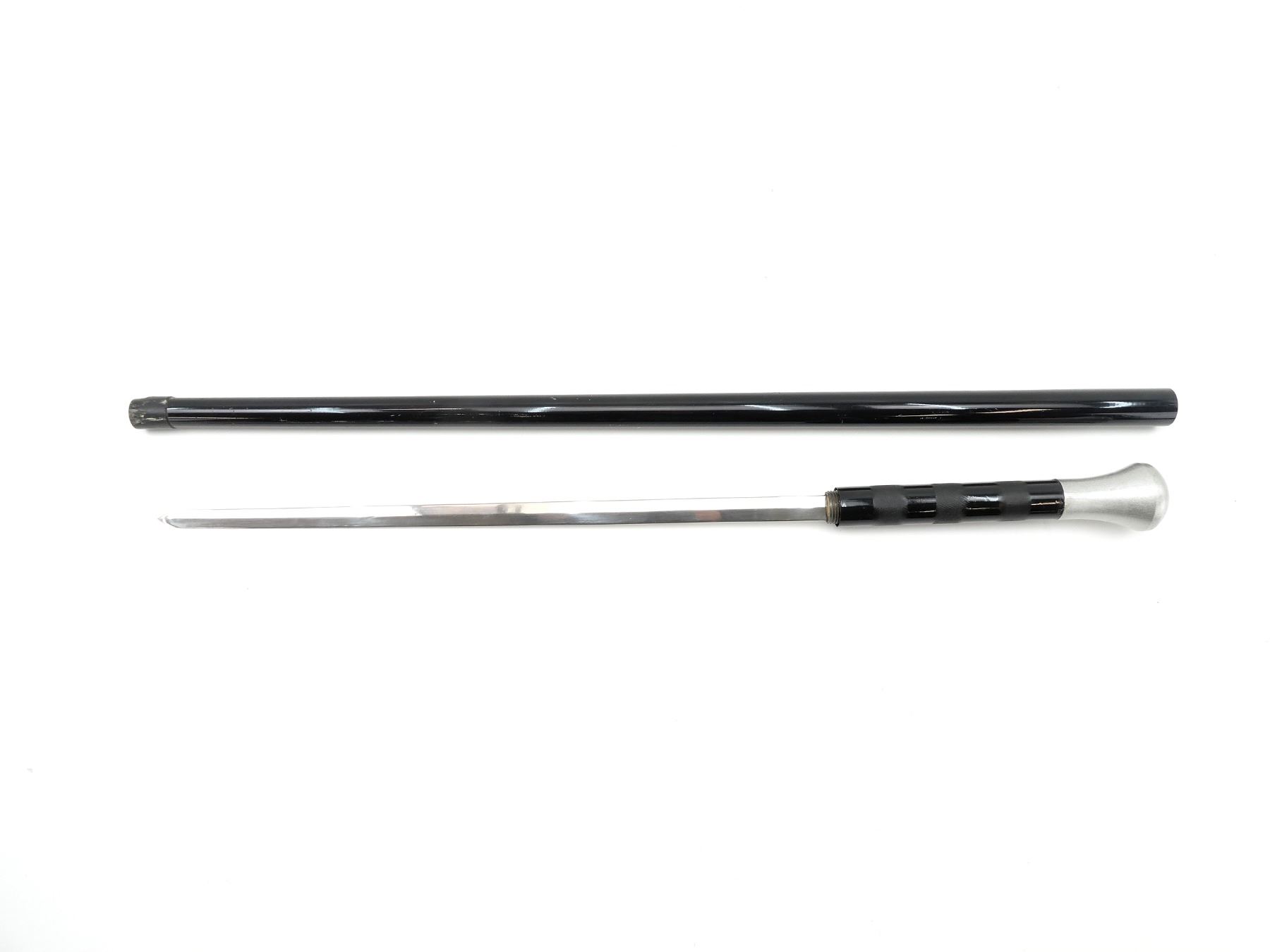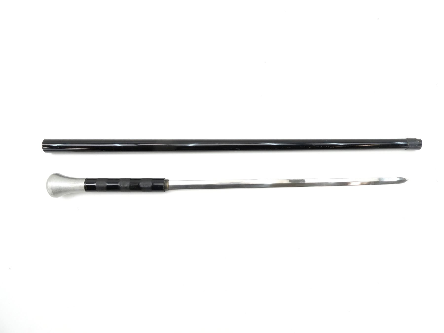 (1) METAL CANE, BATON-STYLE HANDLE, RUBBER FOOT, CANE OVERALL LENGTH APPROX. 37.75", SWORD LOCKS INTO CANE SHAFT, BLADE OVERALL LENGTH APPROX. 18.5", SHOWS WEAR & TEAR / USE MARKS. SEE PHOTOS.