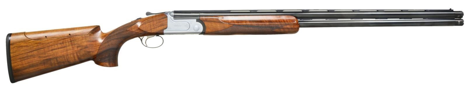 SHOTGUN. Cal. 12 ga., 3". S# 100296. Bbls. 29 3/4" over-bored with long forcing cones, 22mm vent rib and ventilated side ribs. White target front and steel mid bead. Competition interchangeable chokes including 4 extended tubes, 1 skeet, 2 IC and 1 Mod. Satin stainless finished boxlock action with highlights of scroll ornamentation. Stainless steel SST. Selective ejectors. Target forearm and heavy Competition stock with full pistol grip and adjustable comb of fancy walnut with cut checkering. LOP: 14 1/2" over original Rizzini thin black pad. Weight: 8 lbs. UNATTACHED ACCESSORIES: spare chokes, A-Zoom snap caps, gun grease, adjustable comb wrench and spacers. CONDITION: very good, retaining over 98% metal finish. Wood shows areas of light finish wear with a few marks. Very good bright bores. (22-3892/DS). MODERN. $2,000-3,000.