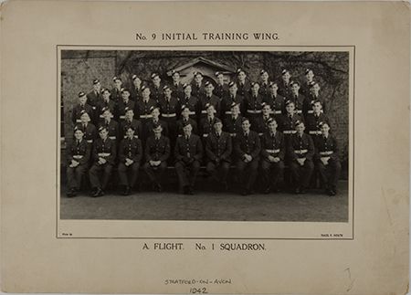 Photo, 14" x 10" b/w (overall), shows a group of about 30 RAF pilots, captioned: No. 9 INITIAL TRAINING WING A, FLIGHT No. 1 SQUADRON", with ink notation at bottom: "Stratford-on-Avon 1942". Corners creased, a stray pen mark, still good.