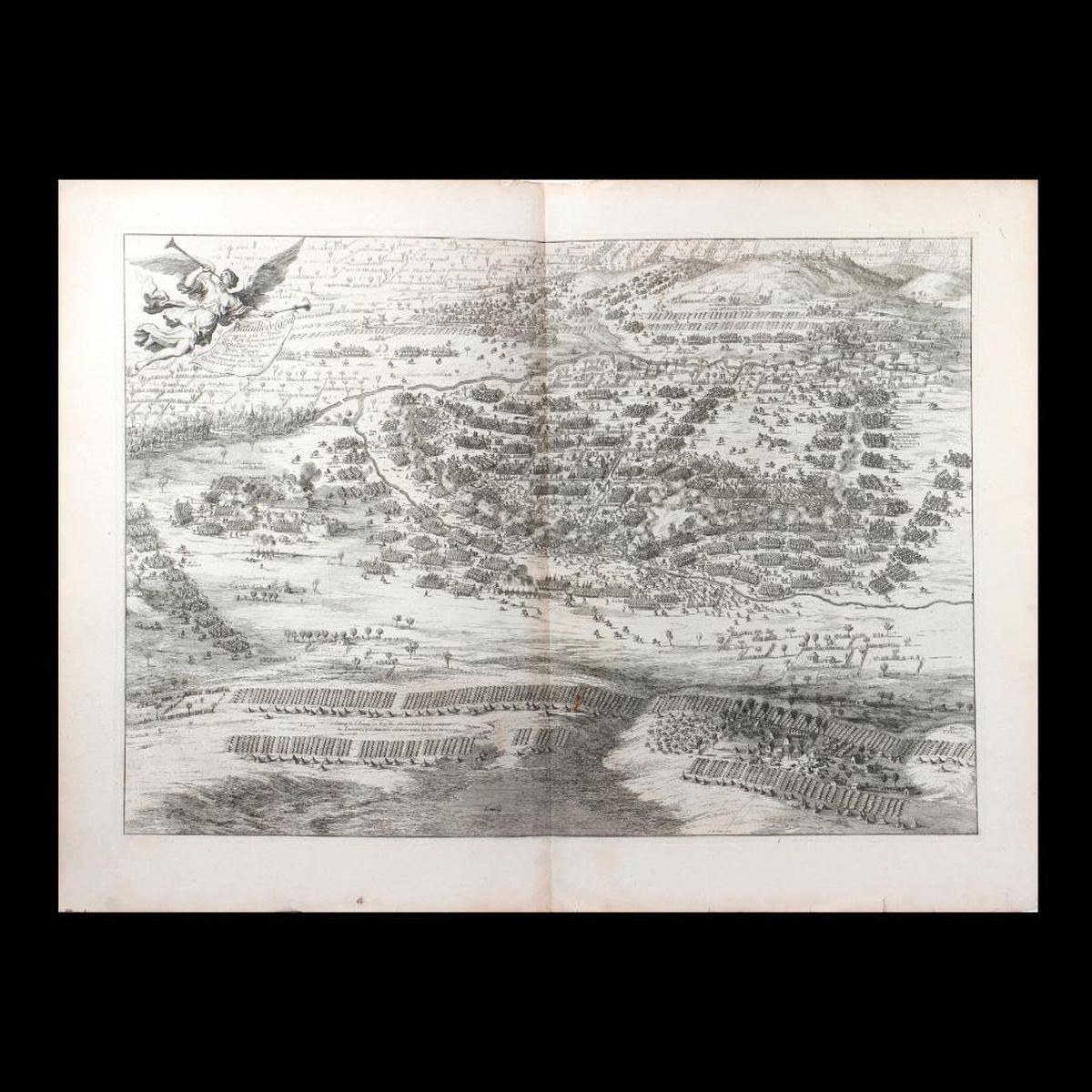 A topographic battle map with fine detail: "Bataille decommandee par Cassel Gaignee par l'Armee du Roy Monsieur frere Unique de sa Majeste. Sur Larmee de Hollande Commendee par Mr. le Prince d'Orange le u d'Auril." Engraved plate, c. 17th/18th Century. 24 3/4in. x 33in. Condition: Overall good; fold down the center; light toning, soiling, small rust stain; edge tears.