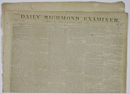 Daily Richmond Examiner, Richmond, Va., July 13, 1863, single sheet. Nearly seven columns of reports from the field by Confederate wounded, news of Lee's army, information from northern papers, the Yankees on the James River, battles before Gettysburg, and more. A fine newspaper from the capital of the Confederacy. Light age, wear, else fine
