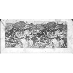 Stereoview card bearing a double 6" x 3" photograph showing the rocks of Devil's Den at Gettysburg. with mock dead soldiers with rifles in the image. The men examining the bodies are supposed to be surgeons, but in reality are the Weaver brothers, photographers in the Gettysburg area. Printed inventory list on verso identifies the scene as: "Dead at Little Round Top, position of Berdan's Sharpshooters". Published by W. H. Tipton, Gettysburg on yellow mount from an original negative by the Weaver brothers in late 1863. Minor edge wear, with upper left corner crease and slight mount loss to right hand corner, some soiling, overall very good.