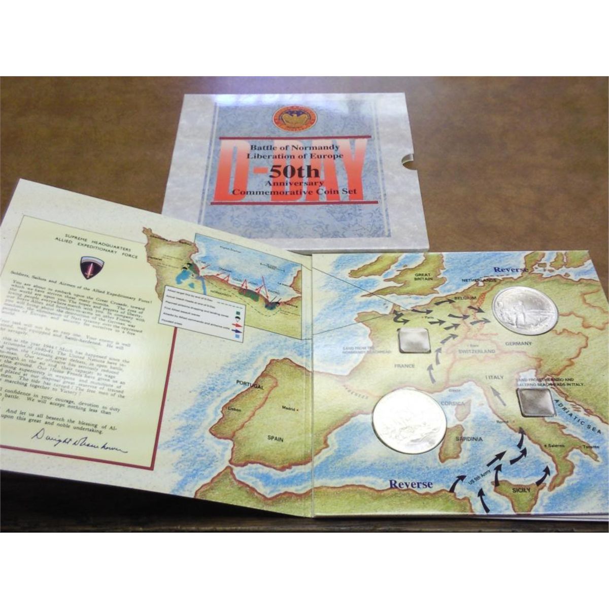 CONTAINS: 1995 WWII SILVER DOLLAR AND 1993 FRENCH SILVER OND FRANC AND SAND FROM NORMANDY AND SALERNO BEACH HEADS AND A MAP