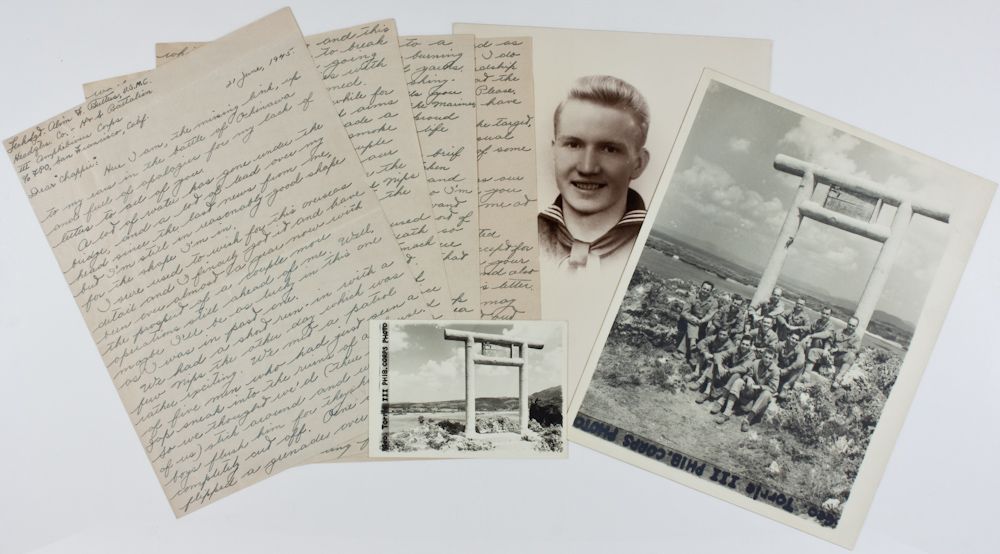 A fine content and very well-written A.L.S. of Alim F. Buttus of Batallion III Amphibious Corps, stationed in Japan, 4pp. 4to., June 21, 1945, to his friend stateside, relaying his experiences. In part: "...Here I am, the missing link, up to my ears in the battle of Okinawa...A lot of water has gone under the bridge, and a lot of lead over my head since the last news...I'm still in reasonably good shape for the shape I'm in. I sure used to wish for this overseas detail and I finally got it and have been over almost a year now with the prospect of a couple more operations...We had a short run-in with a few Nips the other day which was rather exciting. We met a patrol of five men who had just seen a Jap sneak into the ruins of a house, so we thought we'd...stick around and watch the boys flush him out...One of the boys flipped a grenade over the stone wall around the building and this was the cue for all hell to break loose for the one man seen was going in had about twelve buddies and all were well-armed. We were pinned down for a while for they used grenades and small arms fire pretty liberally, but we made a break shortly and when the smoke finally cleared we had a couple of slightly wounded men on our side, and a perfect score on the other side, a baker's dozen of good Nips...After a time you get used to the sight and sound of death but even the most hardened stomach turns at the smell of it...The worst fear of all is felt when you are roused and of a half sleep by the scream of an air raid siren and huddle in a fox-hole listening to the engines purring directly overhead...which is the prelude to a searing explosion which scatters burning bits of shrapnel for hundreds of yards...Such is life, so when some shiny eyed young school boy comes and tells you about the glamour and glory of the Marines, give him the 'scoop.'...We managed to clean up for a brief time and had a group picture [copies included]...We should be about ready to close up shop and go to our rehabilitation area by the time you receive this letter...I would like to have fifteen copies [of the photos]...". Accompanied by five small images of the remains of Japanese temple [?] and seven 8" x 10" sepia images of the group shot Buttus mentions. Also included is an 8" x 10" sepia bust shot of Buttus, looking every bit the "shiny eyed school boy" he once was. Very good condition.