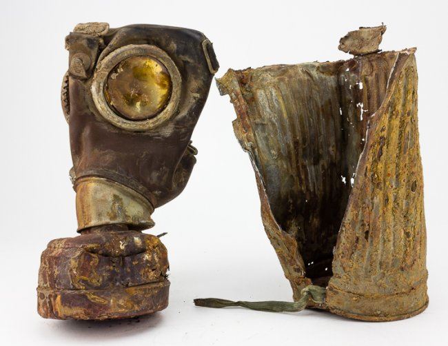 Lot of six relics obtained from a "digger" in the Hurtgen Forest, includes a German gas mask in its original container, portion of a blade and wood handle of a German entrenching tool, barbed wire, a metal ring, and three other pieces of metal, two of which may have come from a shell. Also present is a piece of ledge which the collector marked as being part of the "Kall Trail" which blocked a U.S. tank attack until it was destroyed by engineers. From an official of the Office of Homeland Security who was at the time based in Brussels, with a copy of the collector's business card. The collector varnished his finds for preservation.