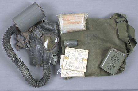 A great battlefield "pick-up" from the area of Manhay, Luxembourg, scene of a fierce battle between American tankers and their SS counterparts in the days leading up to Christmas, 1944, namely an American tanker's gas mask, accompanying bag and accoutrements recovered shortly after the monumental battle. These items, likely lost by a member of the 3rd Armored Division, include a complete gas mask and canister, green canvas bag with stenciled ID "US MASK, PROTECTIVE TANK M25AI", and empty canisters which once held eye ointment and "ANTI-DIM" cloth. One can only image the hell breaking loose when this item was lost! From the personal collection of World War II and Civil War historian Michael Miner. Miner's thirty-year collection was built through an extensive system of contacts he developed with artifact hunters and diggers in Europe and the Far East, and he maintained careful records of the items he amassed.