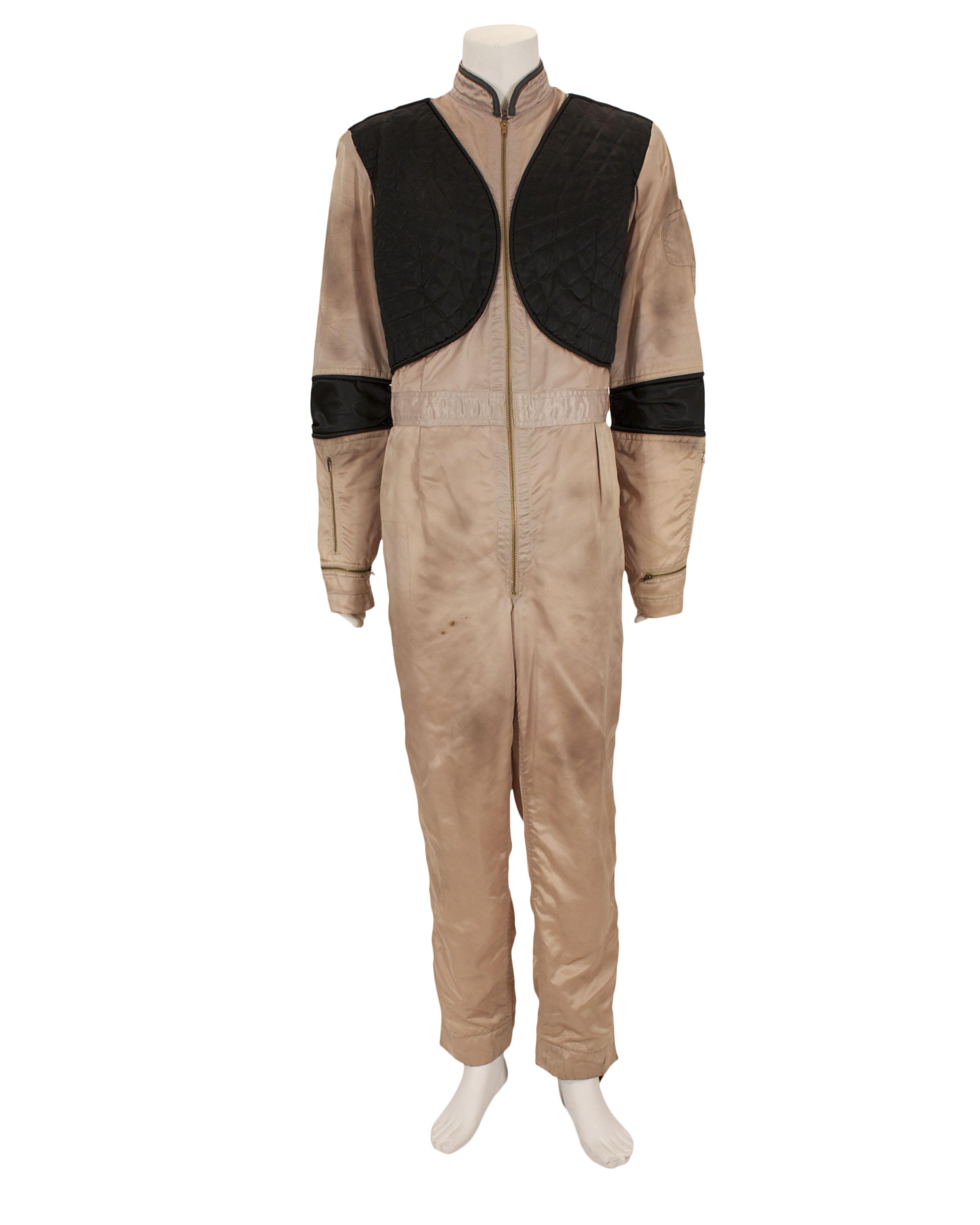 THE OUTER LIMITS / BATTLESTAR GALACTICA (1978) - This futuristic spacesuit was worn in both the original hit television series The Outer Limits (1964) and Battlestar Galactica (1979). The tan zip front suit is made of heavy rayon satin with an attached black quilted vest, stand collar, self-belt, multiple zippers on the sleeves and ankles, and wide black bands at the elbows. Black trim on the collar, padded black shoulder bands, and large black patch pockets on each leg were visible in The Outer Limits, but removed for use on Battlestar Galactica.