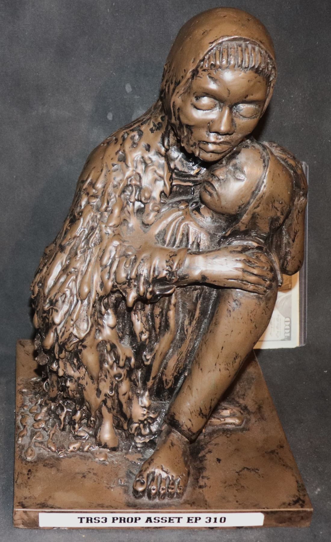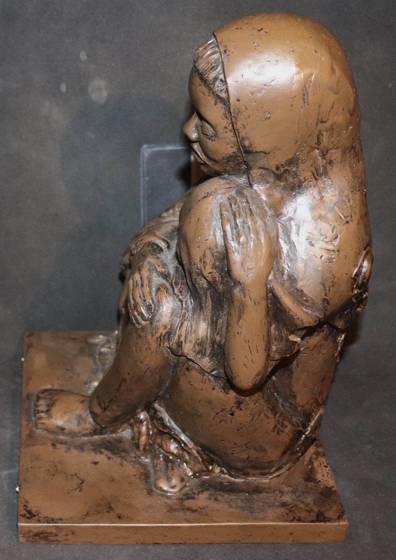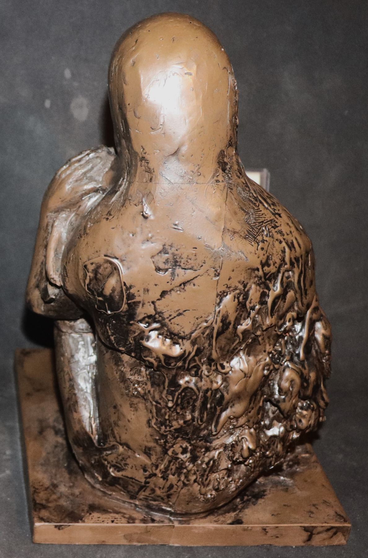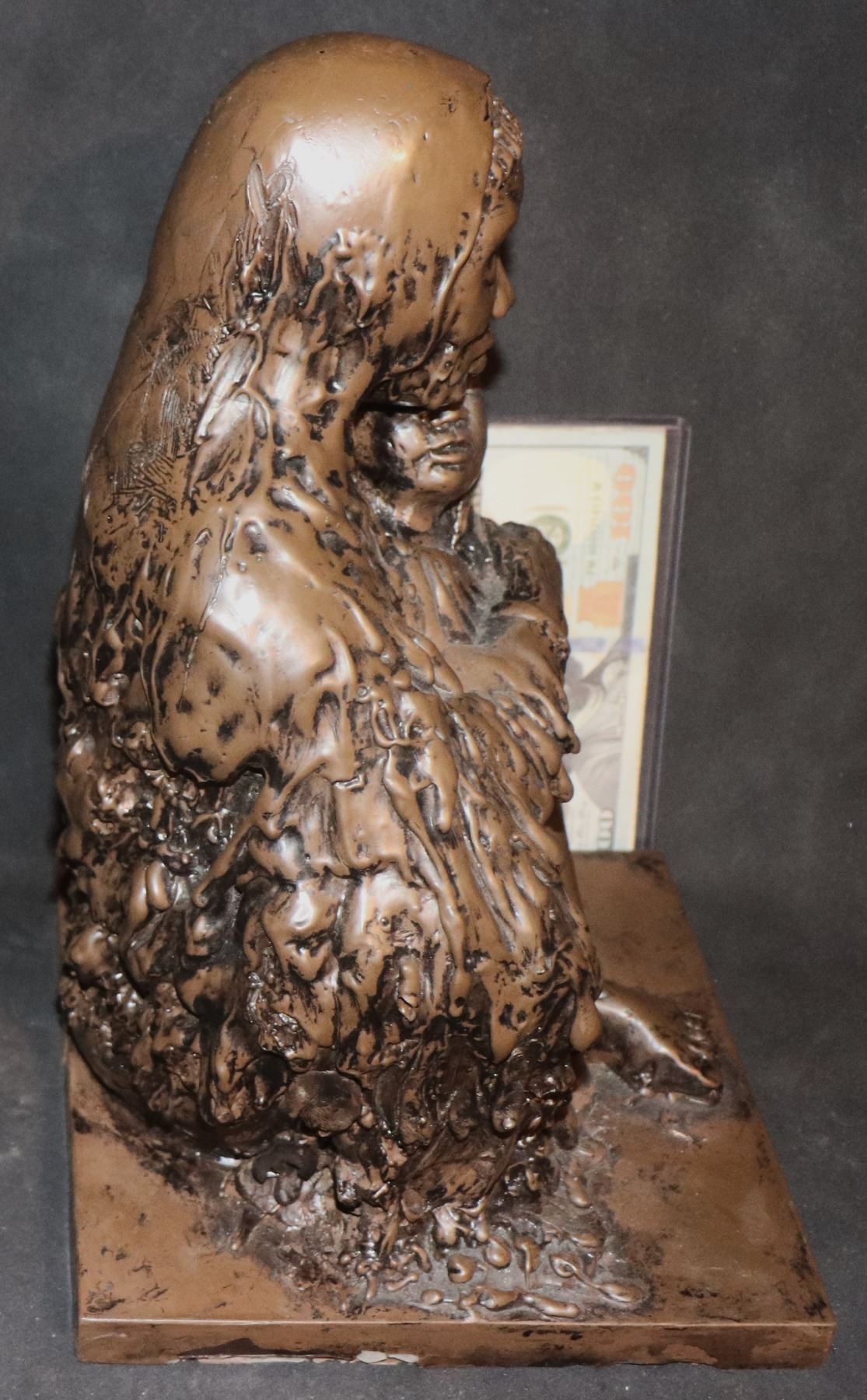 Heavy solid stone resin painted to look bronze. Has a production label on base.