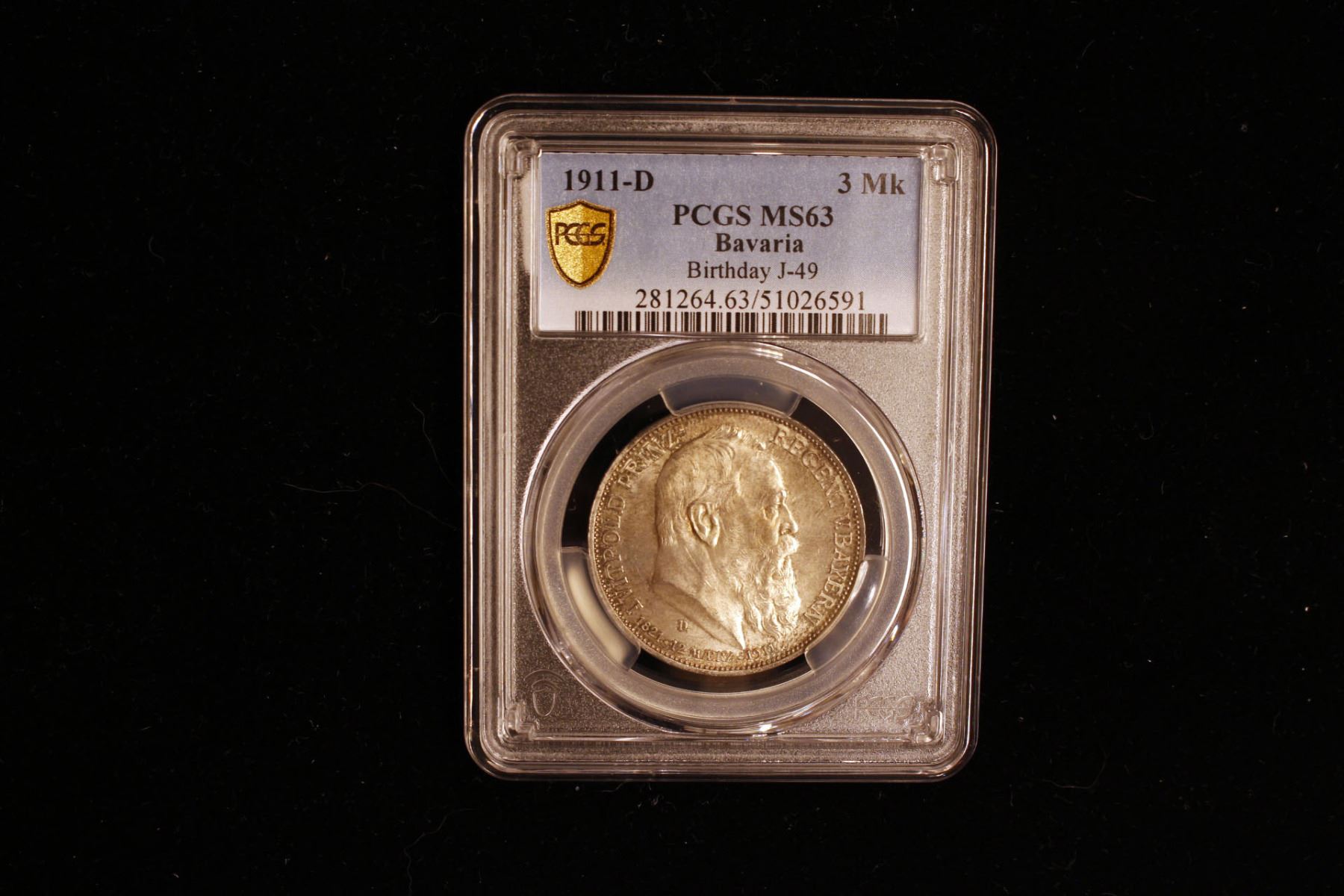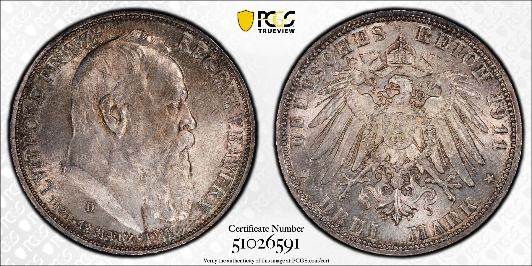 BAVARIA: Otto I, 1886-1913, AR 3 mark, 1911-D, KM-998, 90th Birthday of Prince Regent Luitpold, a lovely mint state example! PCGS graded MS63.