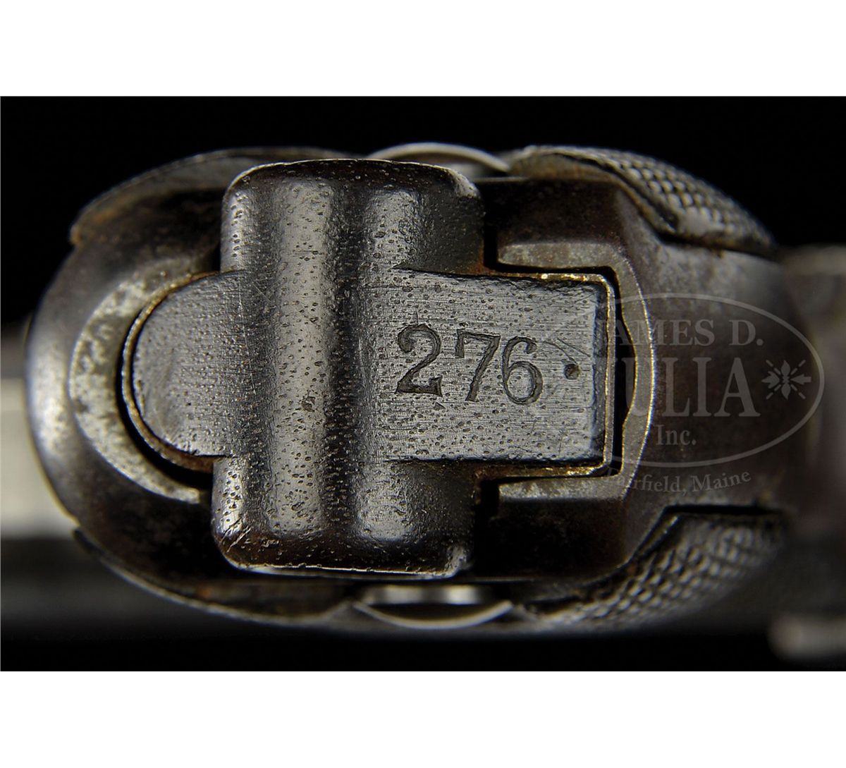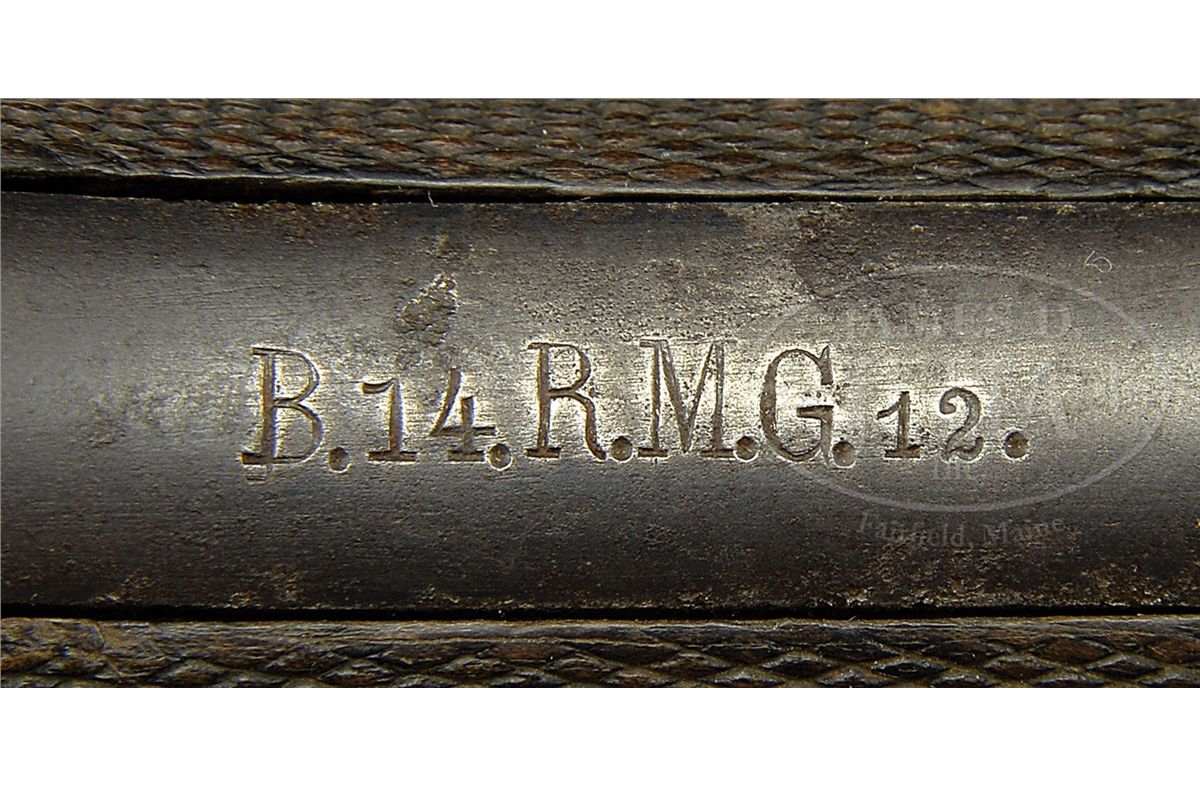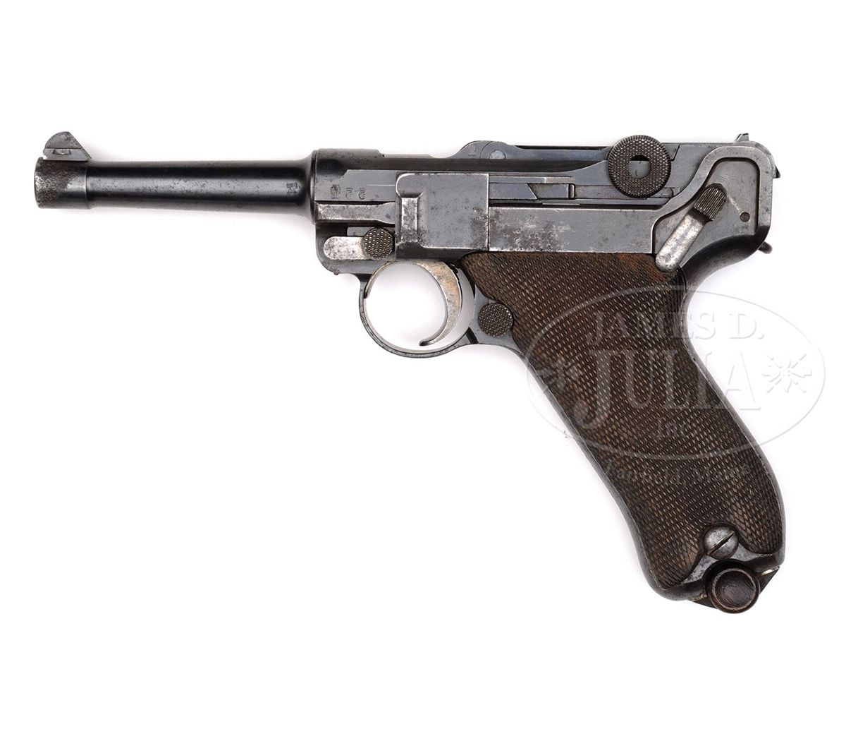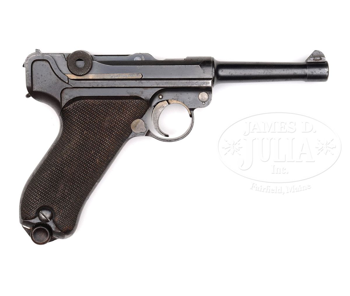 SN 276. 4" 9mm bbl. "DWM" scroll on center toggle link. Two Imperial proofs on left side of receiver. All numbered parts are matching including both orig wood bottom magazines, one magazine having the period mark (276.) indicating it to be the original magazine to the pistol, the other without the period indicating it to be the spare. Serial number 276 making it one of the earliest of this model produced known today. No holdopen added. Front grip strap is unit marked "B.14.R.M.G.12." (Bavarian 14th Reserve Infantry Regiment, weapon number 12). Comes in a brown leather "AWM / 3 / 09" marked holster with orig Imperial proofed takedown tool. Back of holster is stamped "14IR. / 12." (14th Infantry Regiment Weapon number 12). This gun is featured on pgs. 314, 483, 570, 1108, and 1151 of Dr. Geoffrey Sturgess' The Borchardt & Luger Automatic Pistols. This was the earliest complete matching 1908 rig encountered in the research of this book. PROVENANCE: Collection of Dr. Geoffrey Sturgess. CONDITION: Fine retaining about 60% blue with scattered pitting on the gun that is deepest on left side around sideplate and front of bbl. Grip straps are turning to brown. 50% orig straw with scattered corrosion. The bore is bright with light wear. Checkered walnut grips are worn with a few minor dings and indents. Magazines are very good with corrosion on the bodies. Holster is very good with minor scuffs, wrinkles and surface cracking. Takedown tool retains about 70% blue and has scattered light corrosion. 4-52114 BWS91