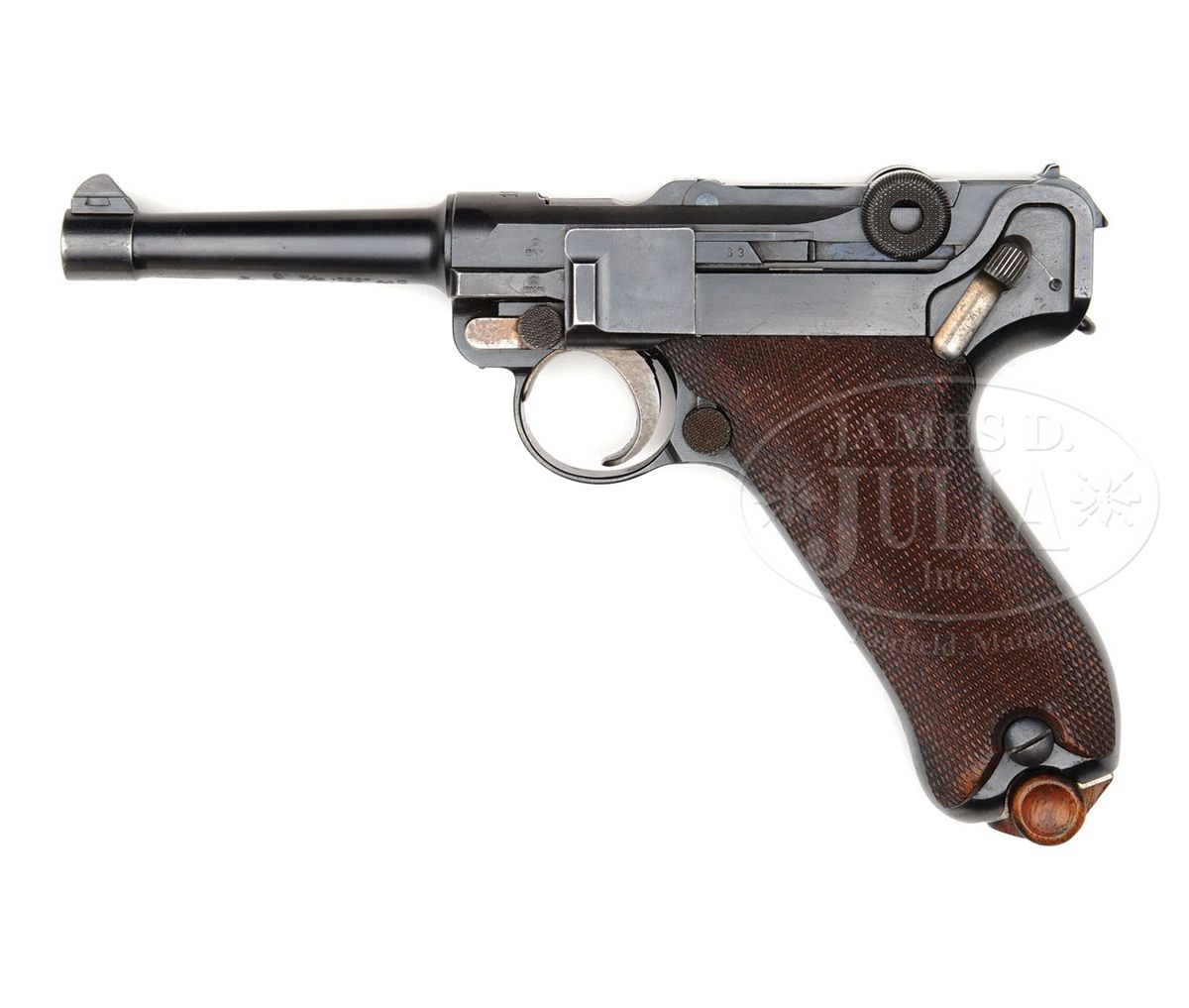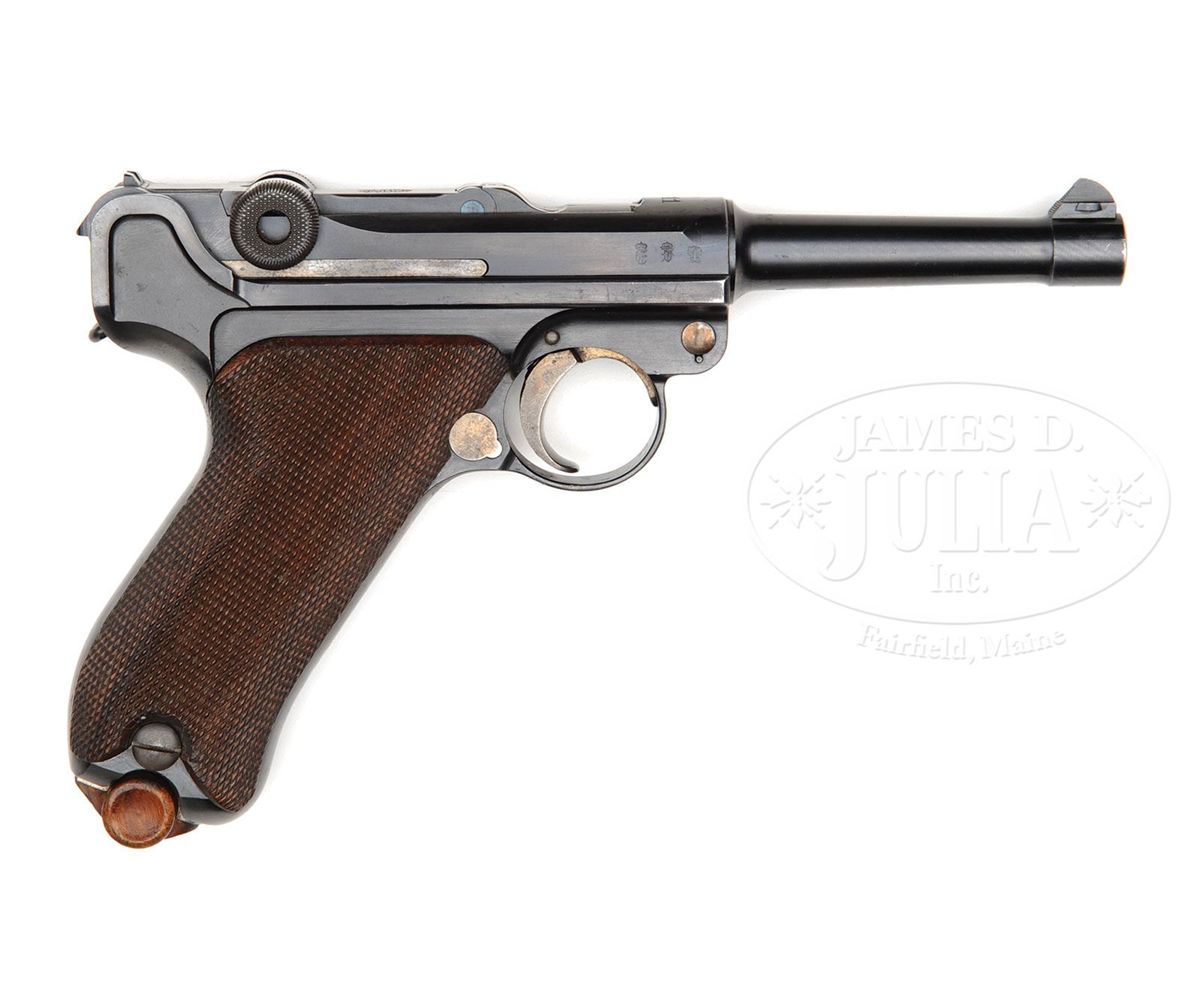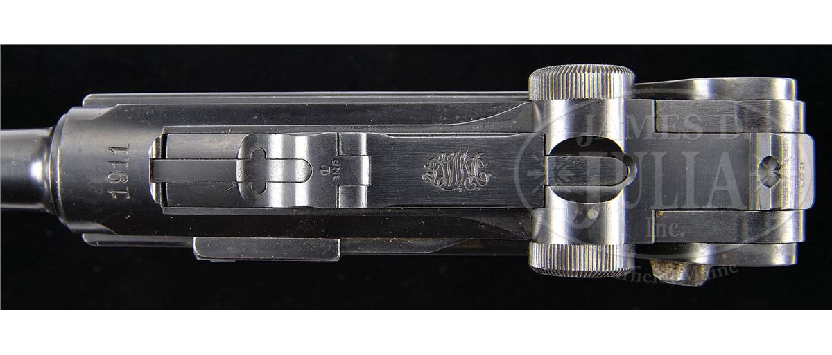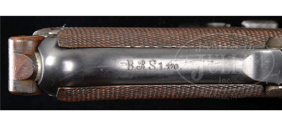 SN 1463e. 4" 9mm bbl. "1911" marked above chamber. "DWM" scroll on center toggle link. Imperial proofs on right receiver. British proofs on main parts. Unit marked "B. R. S. 1. 170." on front gripstrap indicating: Bayerisches Reserve (Bavarian Reserve) Company 1, Weapon no 170. No stock lug and no holdopen added, which is unusual and desirable as most early Prussian unit issued guns had holdopens added during the 1913 upgrade recall. All numbered parts on the gun are matching including the checkered walnut grips. Proper 1908 style large vertical numbered wood bottom magazine that does not match. This gun is featured on p. 572 of Dr. Geoffrey Sturgess' The Borchardt & Luger Automatic Pistols. PROVENANCE: Collection of Dr. Geoffrey Sturgess. CONDITION: Excellent retaining 97% original blue with some light scratches and 70% original straw. Bore is bright with light wear. Grips are lightly worn with a few minor indentations. Magazine is excellent. Mechanics are excellent. 4-52919 BWS52