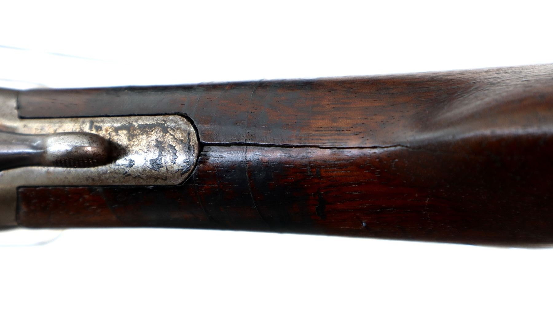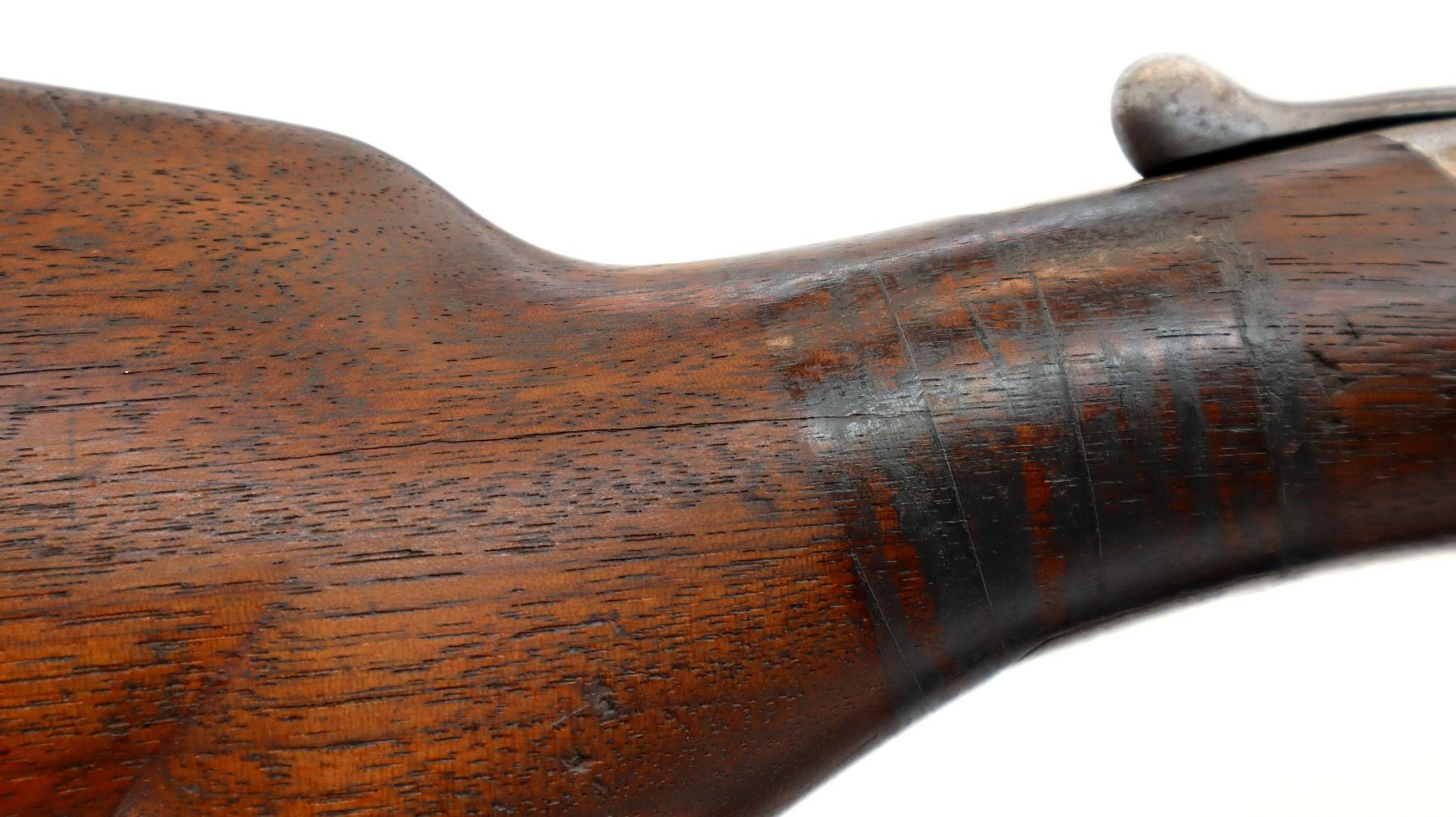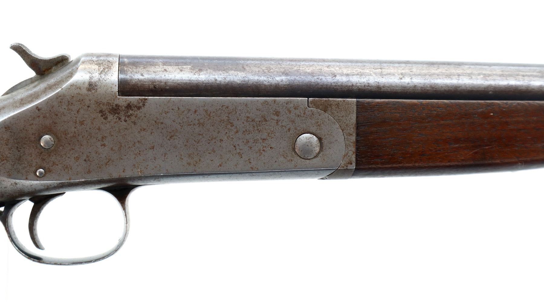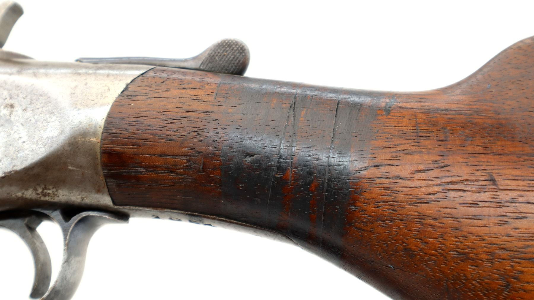 Main Description: Silver bead, blued finish, round barrel, grooved spur hammer, extractor. Two piece wood stocks, pistol grip cracked and loose behind receiver, smooth steel butt plate.