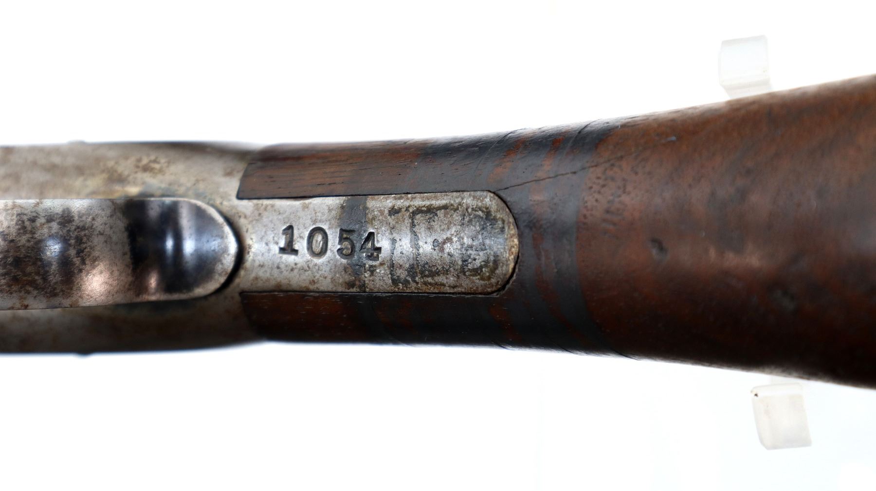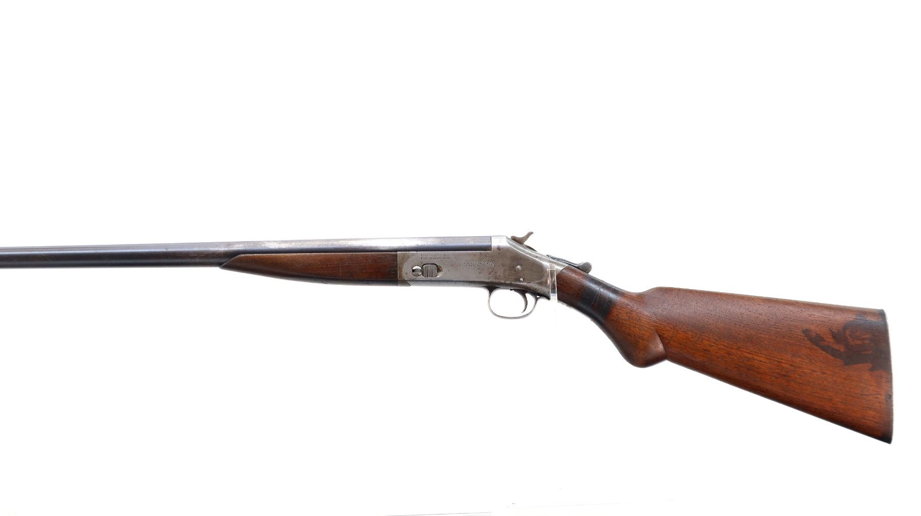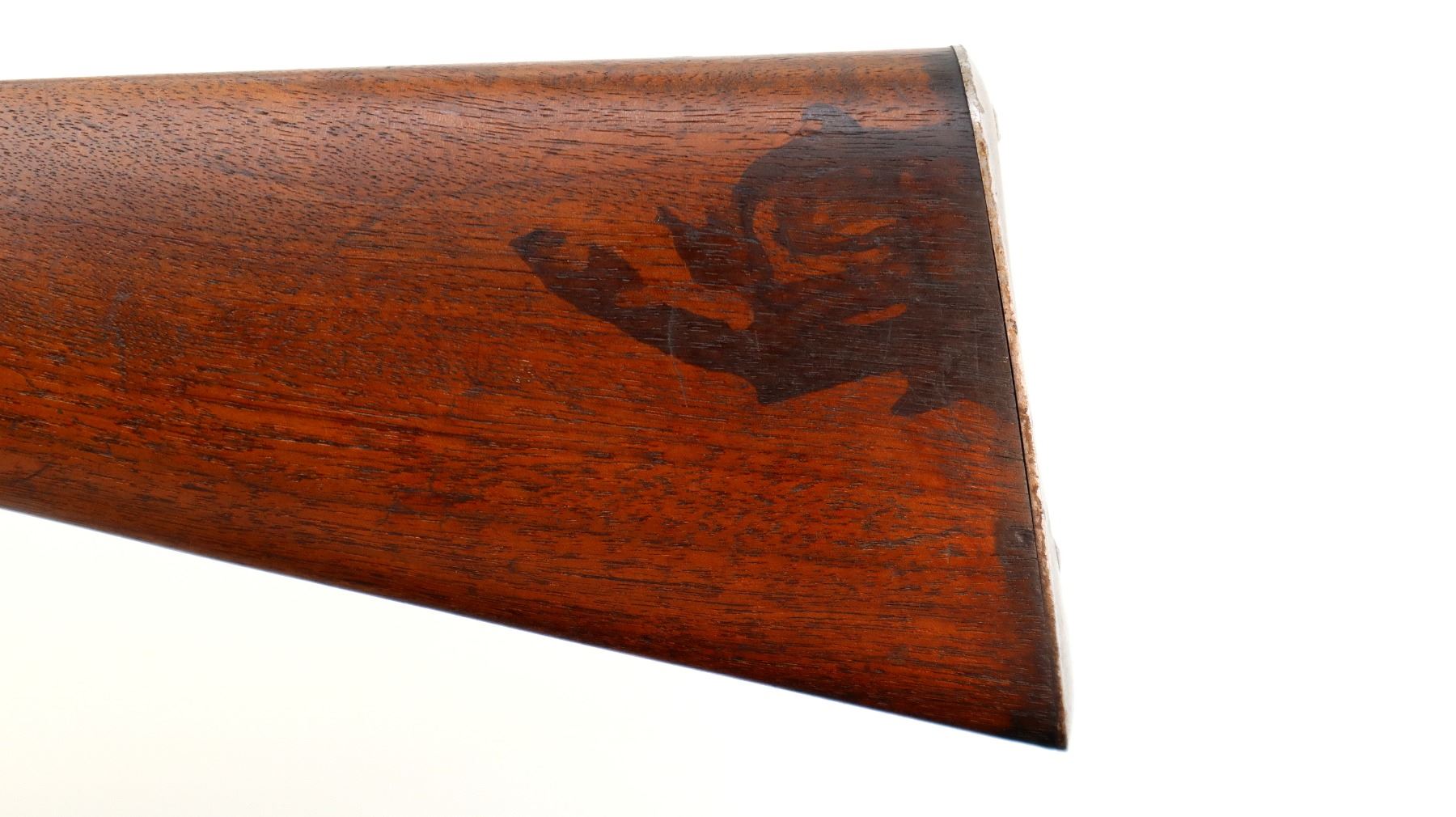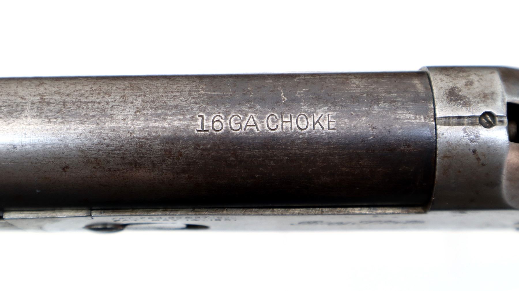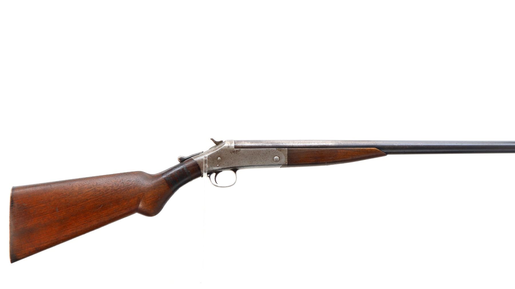 Main Description: Silver bead, blued finish, round barrel, grooved spur hammer, extractor. Two piece wood stocks, pistol grip cracked and loose behind receiver, smooth steel butt plate.